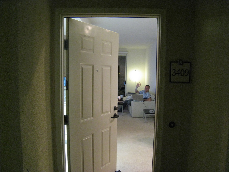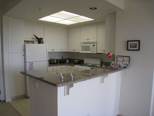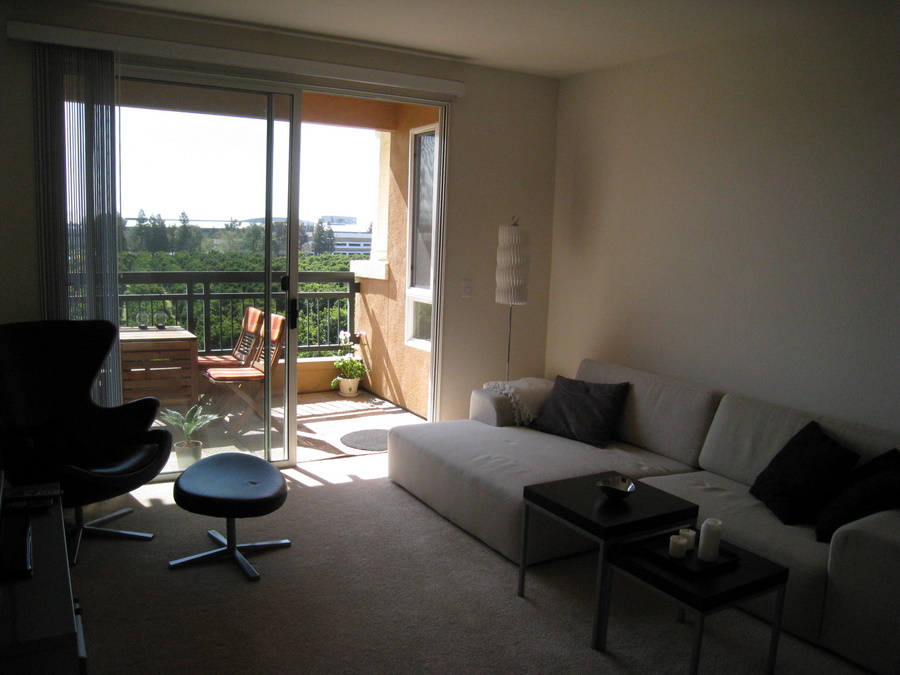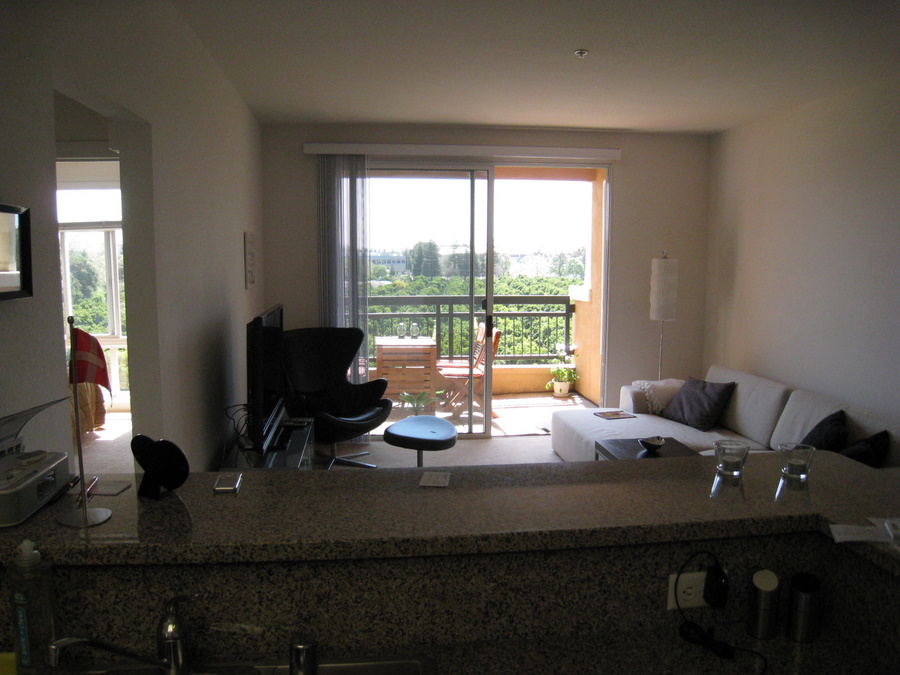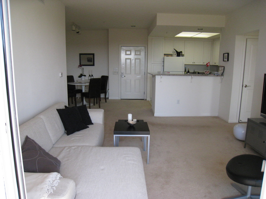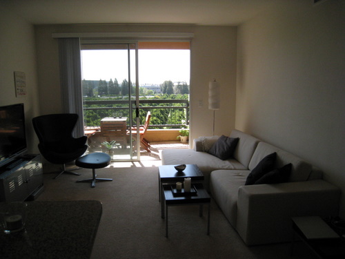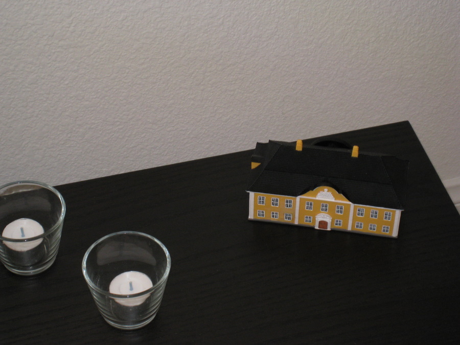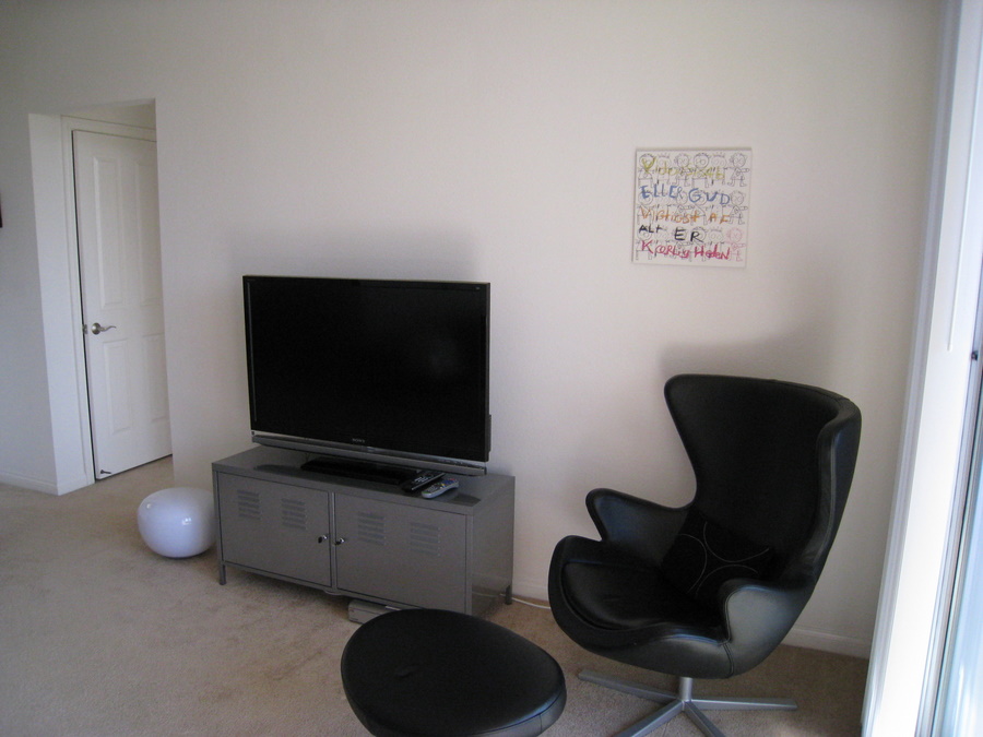 Vore lille stue, hvor vi alligevel fik plads til alle de medbragte møbler - og en stor fladskærm!