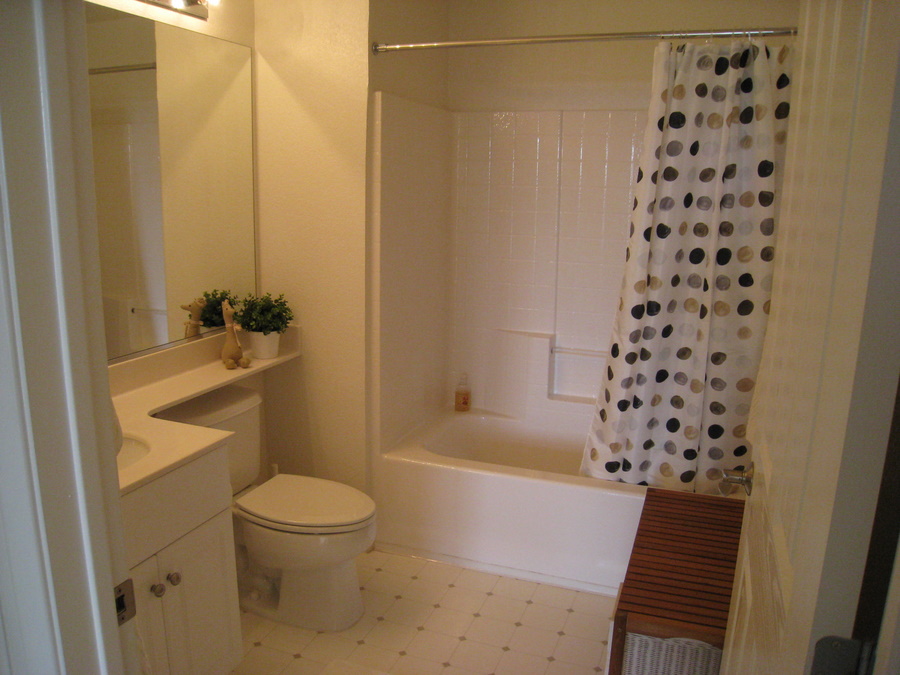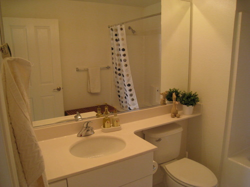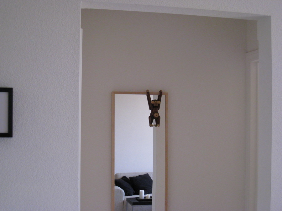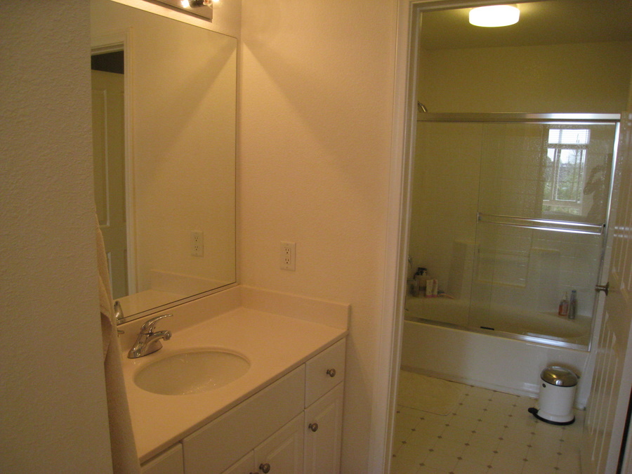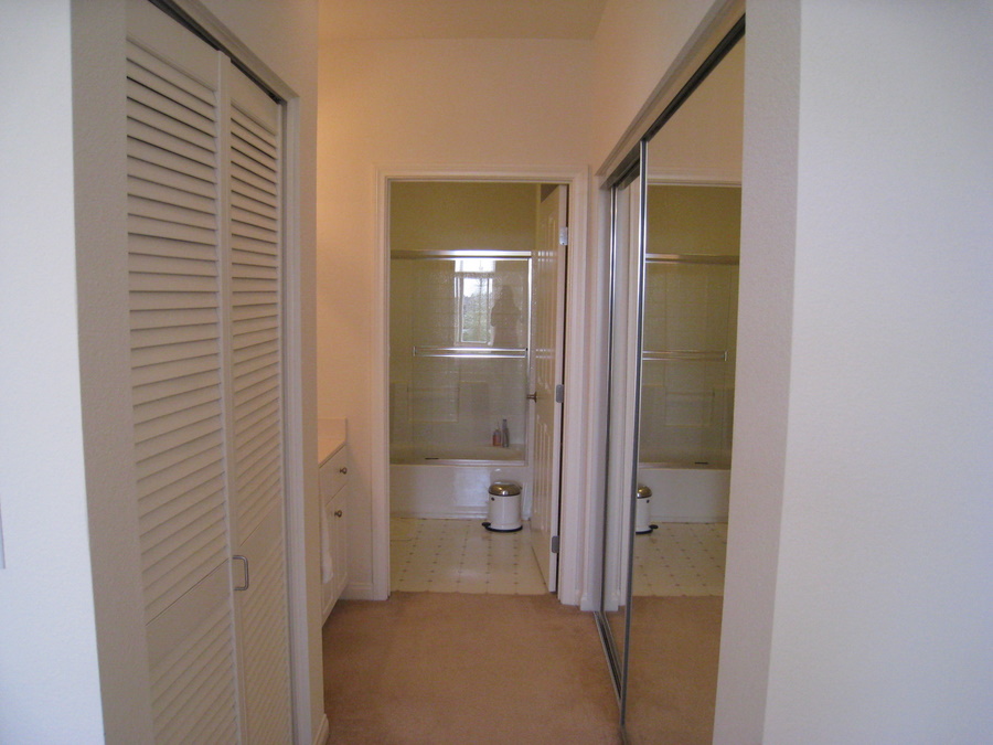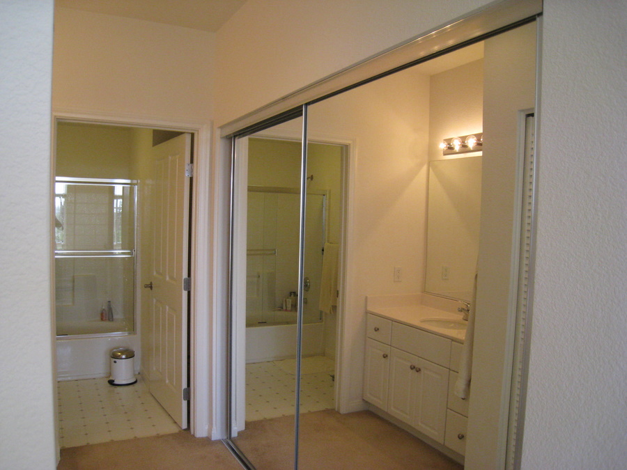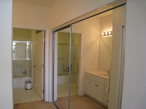 For enden af soveværelset er vores badeværelse i forlængelse. Lidt specielt med gulvtæppe ved håndvasken! Vi har masser af skabsplads - og alle skabe er spejllåger!