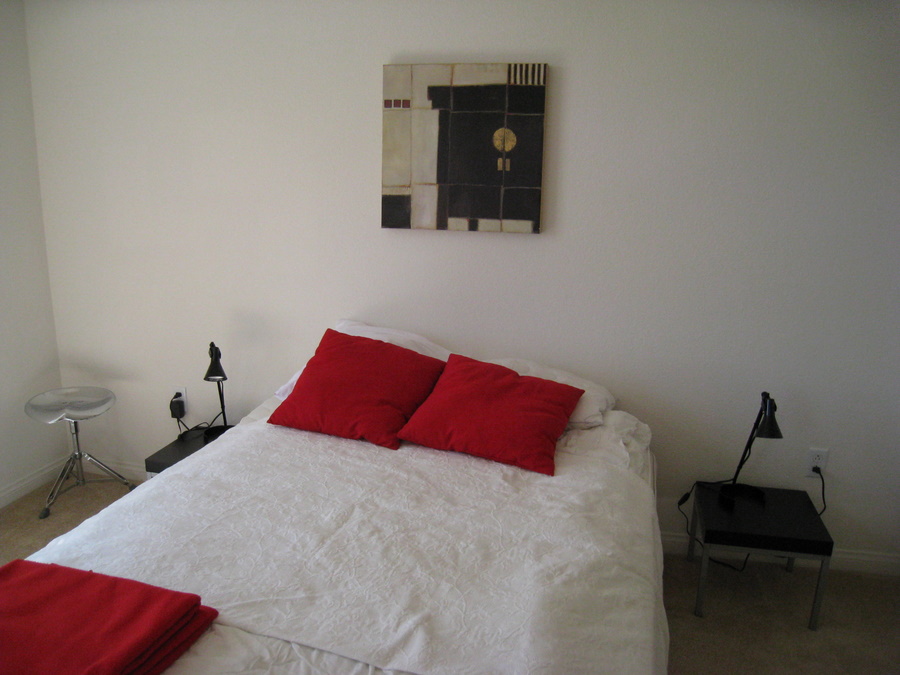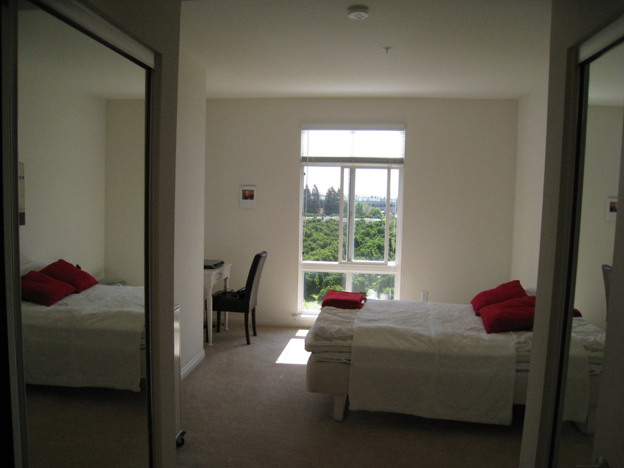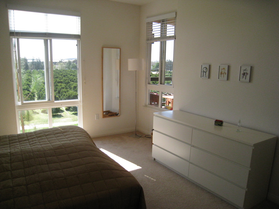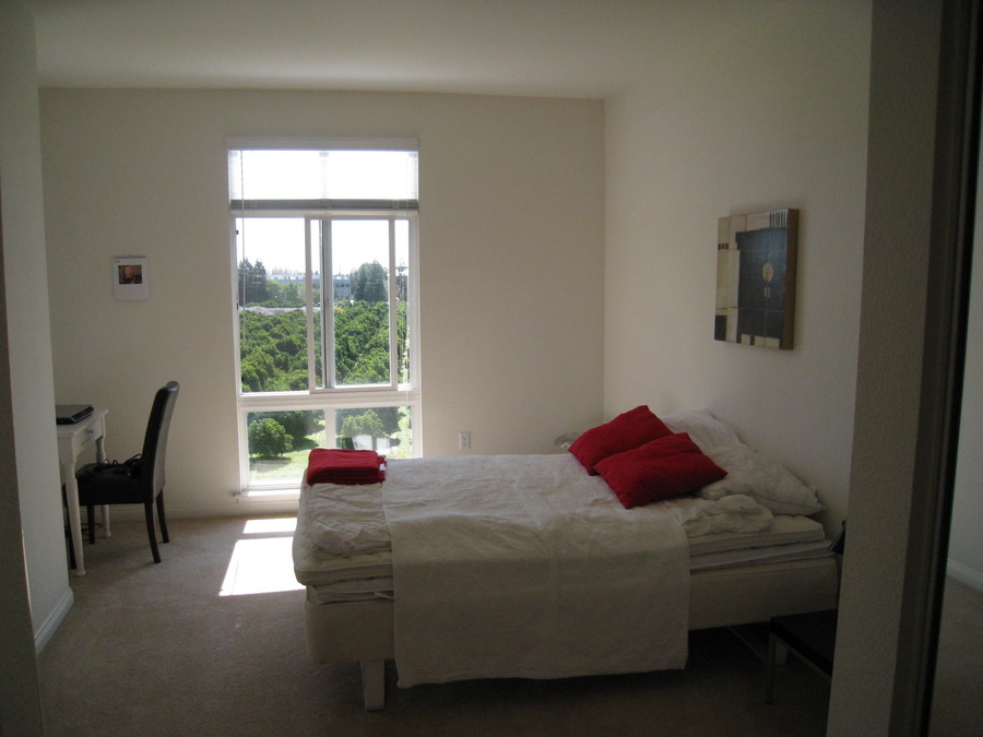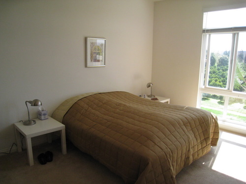 Vores soveværelse - dejligt lyst, med en skøn udsigt fra sengen, og vinduer næsten til gulvet.