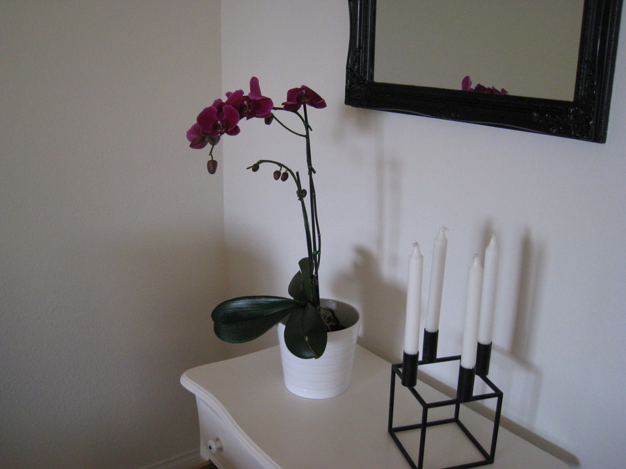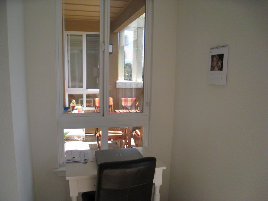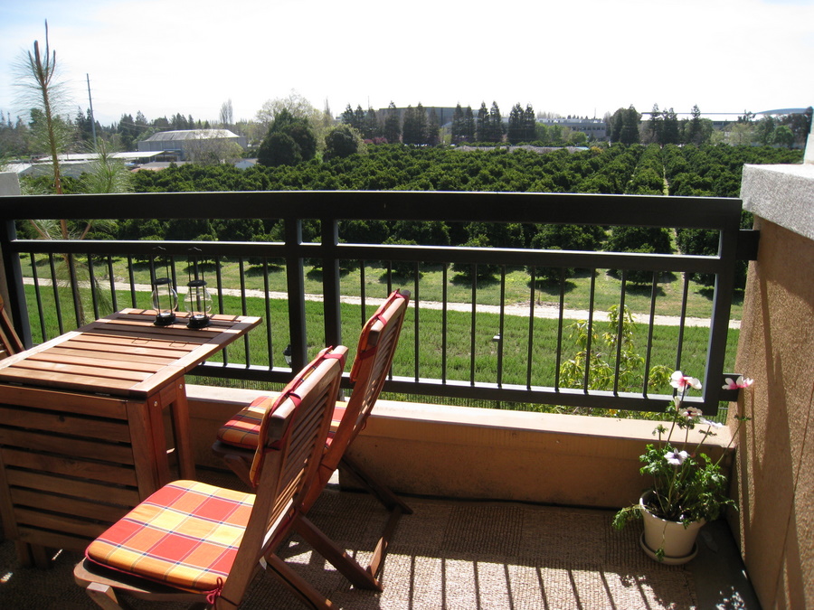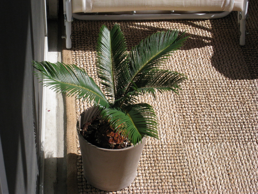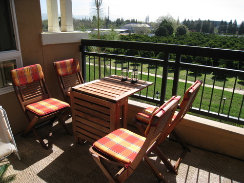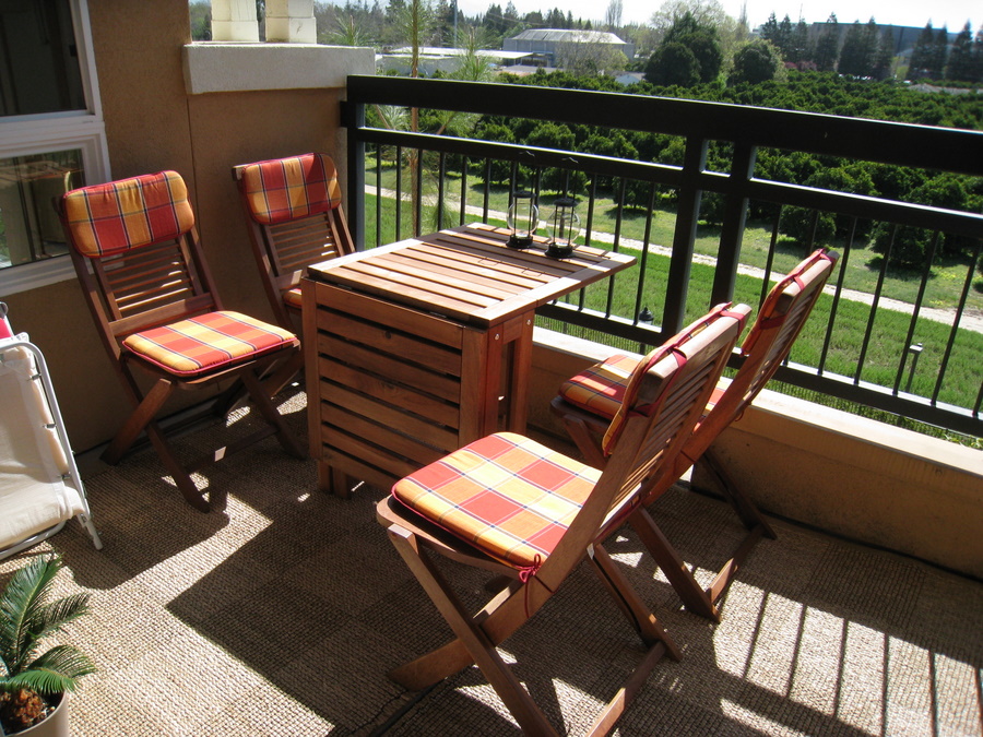Vi nyder vores dejlige solrige altan, og har lagt sivmåtter på det kolde betongulv.