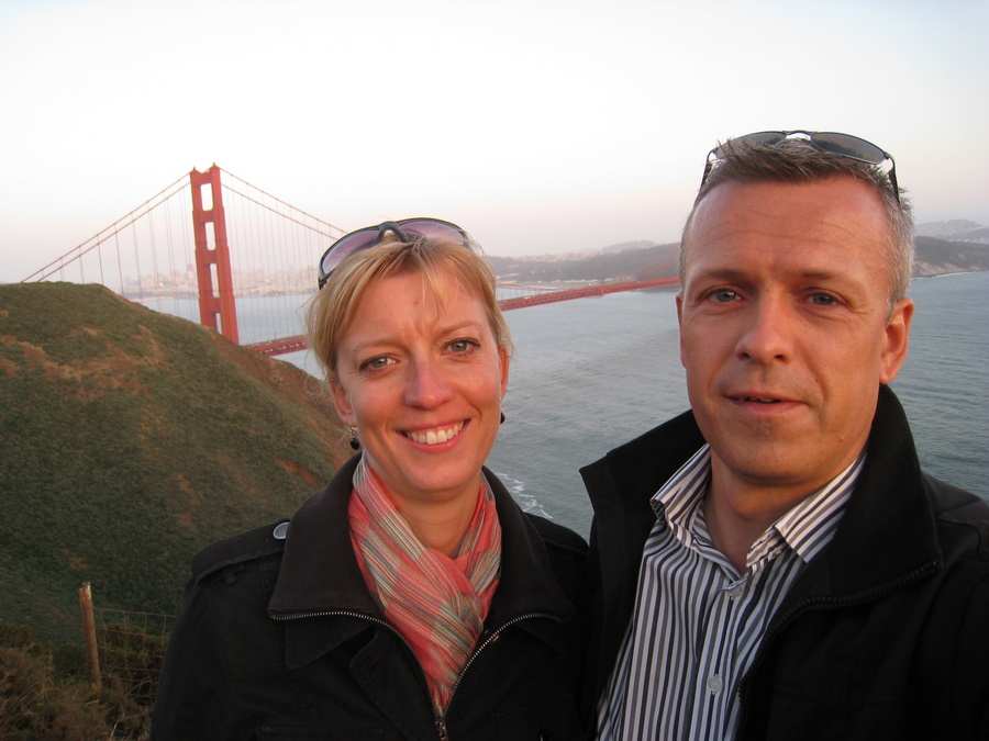 Vi kørte hjem over San Francisco, og holdt ved et viewpoint for at se solnedgangen ved Golden Gate - det var rigtig flot, men meget koldt! Vi fik set den flotte skyline med lys på.