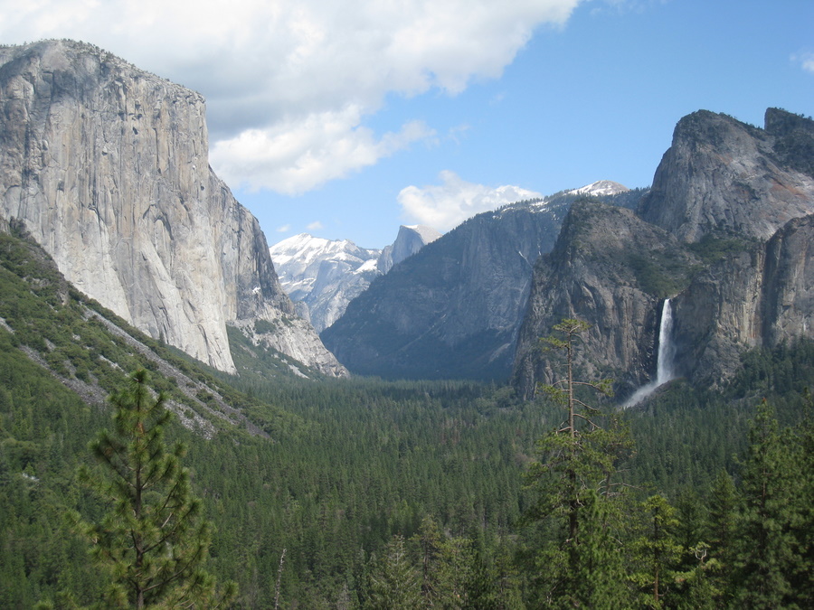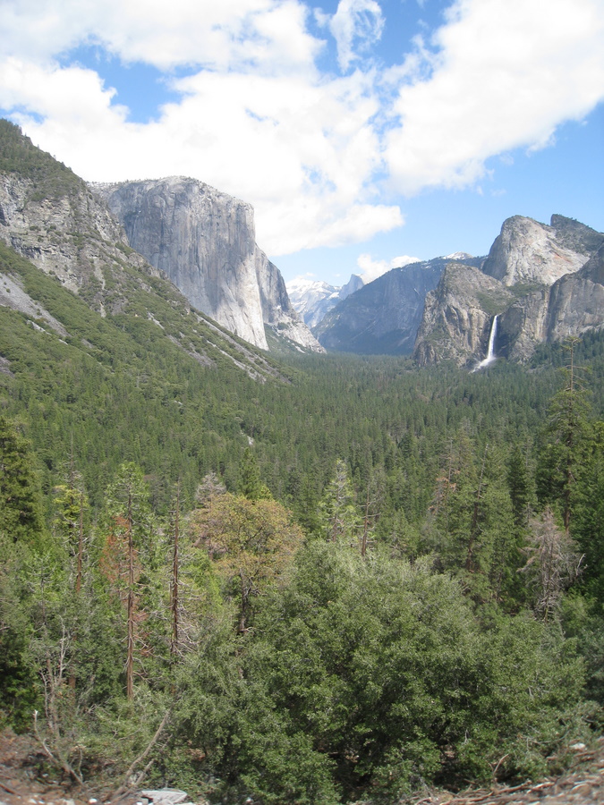 Derefter kørte vi op og så det berømte "Tunnel View", der er den berømte udsigt ud over Yosemite valley. Det var fantastisk flot og meget storsået. Nede i dalen er der flere veje, men man kan slet ikke fornemme det ved det store view ud over dalen.