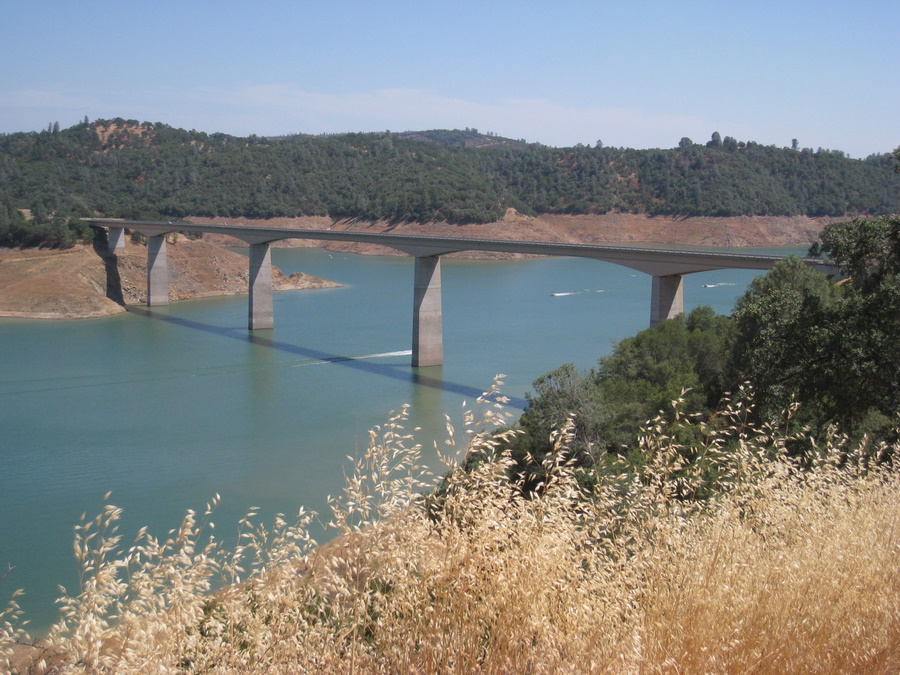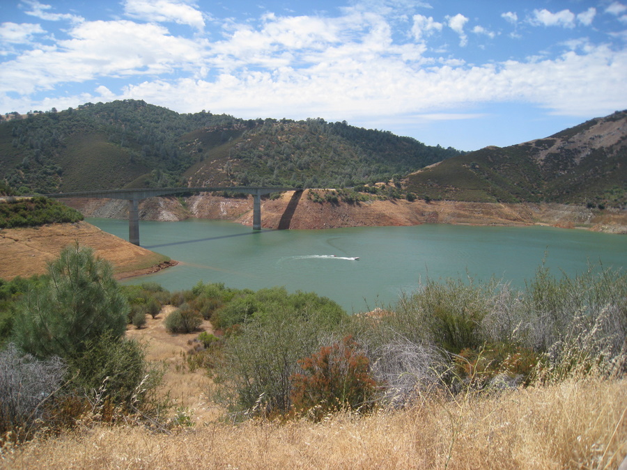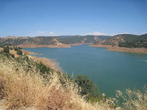 Efter besøget i Columbia med en temperatur omkring de 40 grader kørte vi rundt om den opdæmmede sø New Melones Lake, som løber ud i Stanislaus River. En overgang viste bilens temperaturmåler 112 grader som svare til 44,6 grader.