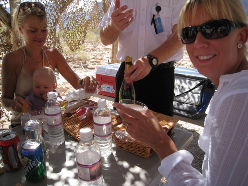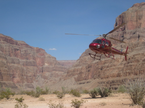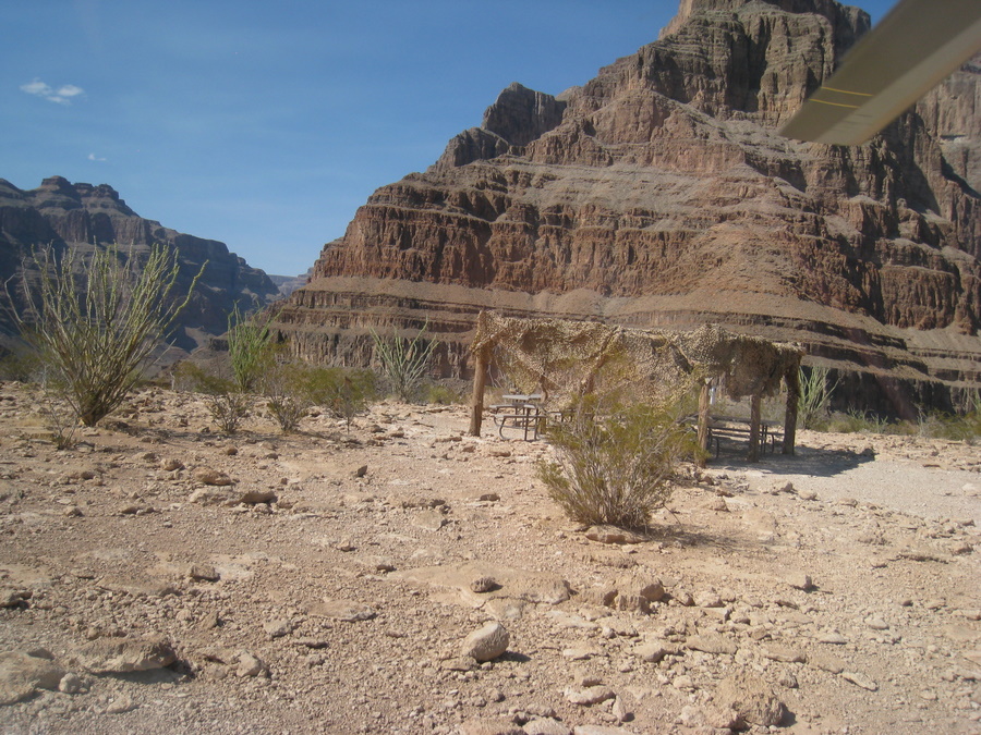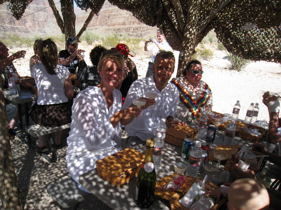 Vi landede sammen med en anden helikopter i den vestlige del af Grand Canyon (West Rim) og fik en fin frokostmadpakke og champagne!