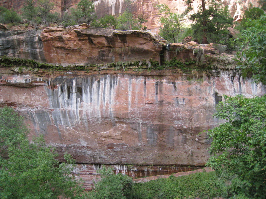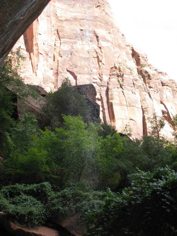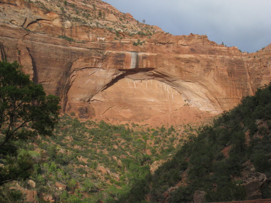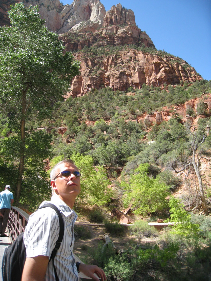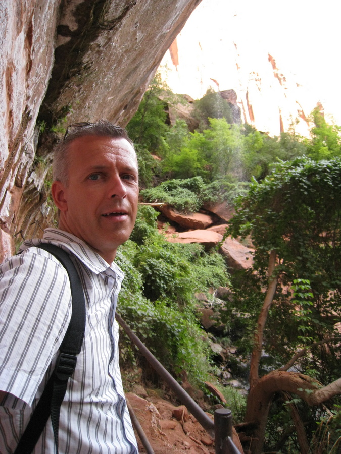Hans under vandfaldet (Emerald Pools) - eller det der var tilbage her om sommeren. Man kan kun lige ane vandet på billedet