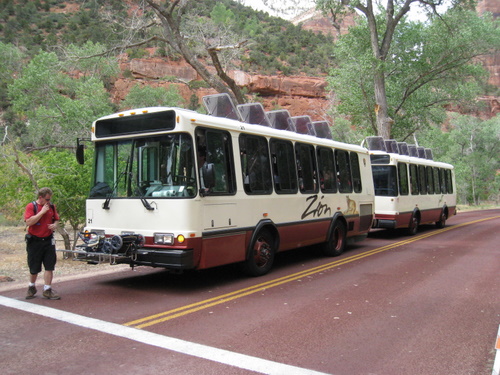 Man måtte ikke køre rundt i bil inde i parken, men parkerede ved visitorcentret og tog herefter busser rundt. Busturen hele vejen rundt og retur tog ca 90 min. Det fungerede rigtig fint, og vi ventede aldrig mere end 5 min på en bus. Man kunne gøre de stop man ønskede, men alle stop indebar at man skulle gå alt fra et par km op til 22 - så vi valgte de ruter der så lettest fremkommelige ud, men hvor vi samtidig fik noget forskelligt at se. Det blev overskyet i løbet af dagen, ærgelig m.h.t. billederne, men især Lisa synes det var meget passende da det lettede den fysiske aktivitet!!
