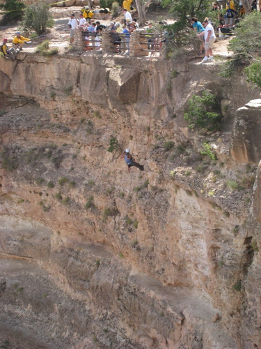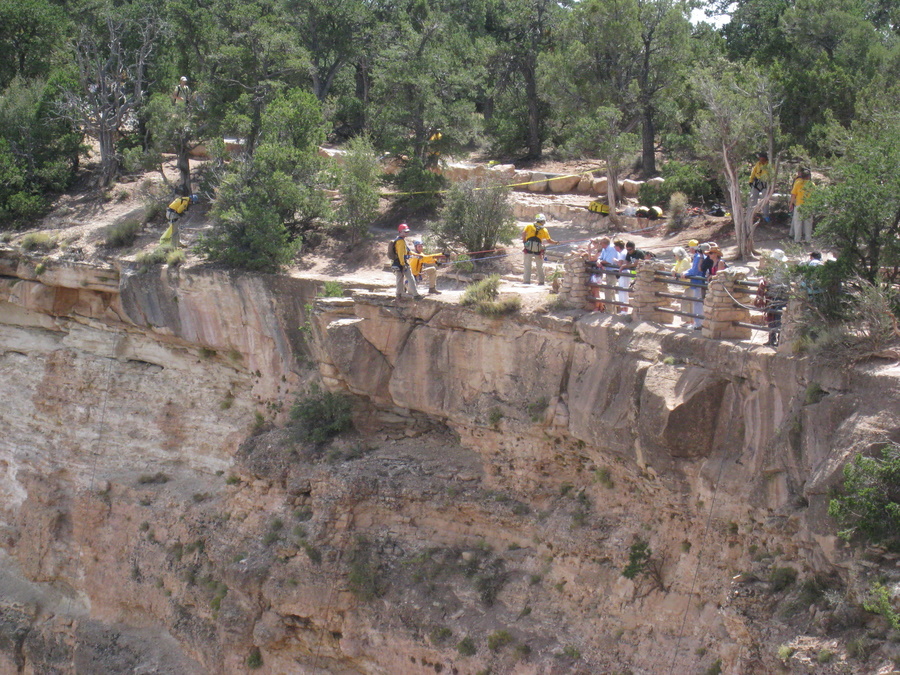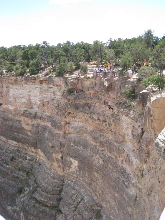 Et sted kunne vi se at der var bjergbestigere ved at gøre klar til en tur ud over kanten...pu ha. Det viste sig senere at de var der for at rydde op og samle det op som folk havde tabt langs kanten - bl.a. solbriller og hatte.