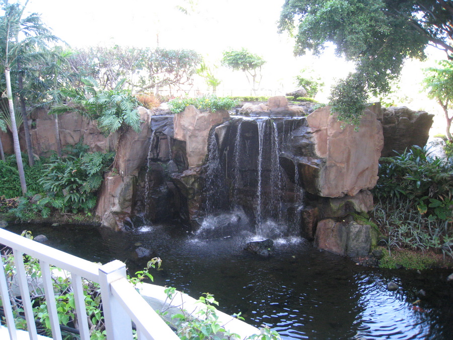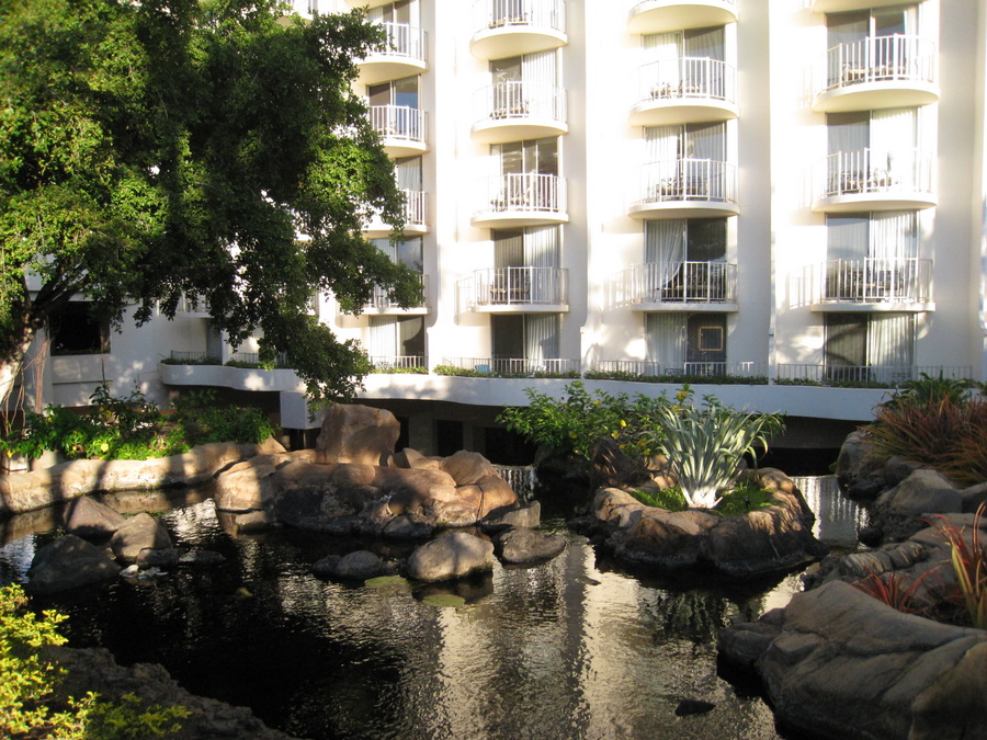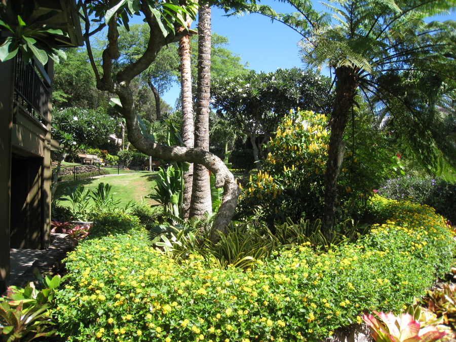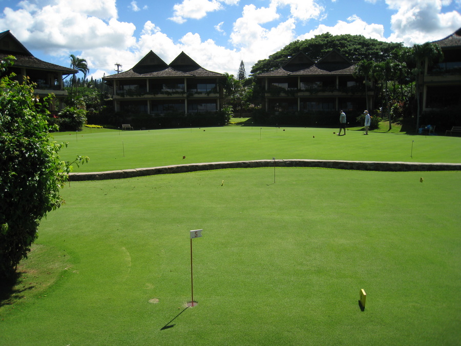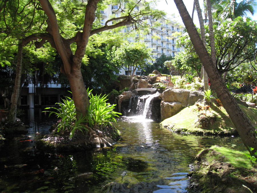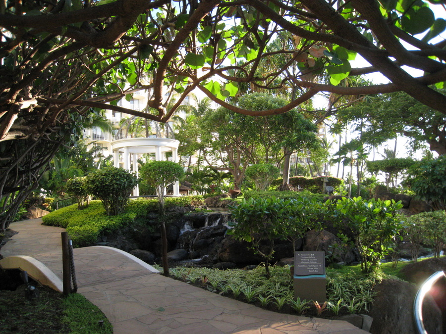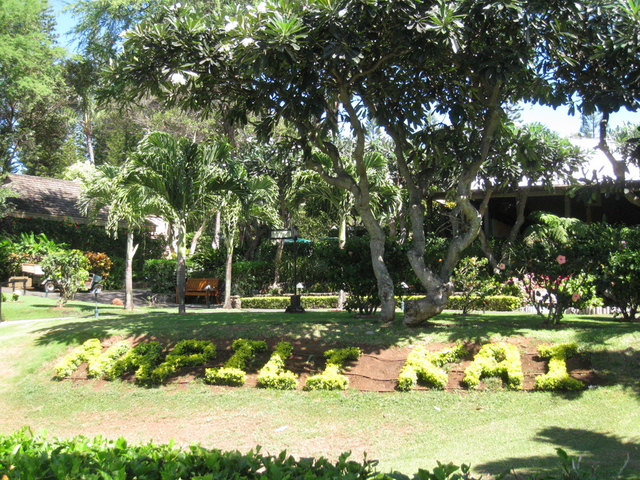 Det var et lækkert sted, og meget rolig og stille, når vi kom lige fra Waikiki Beach. Faktisk skulle der være helt ro kl 22! Der var mange flotte planter og blomster over det hele, og hotellet havde deres egen lille putting green.