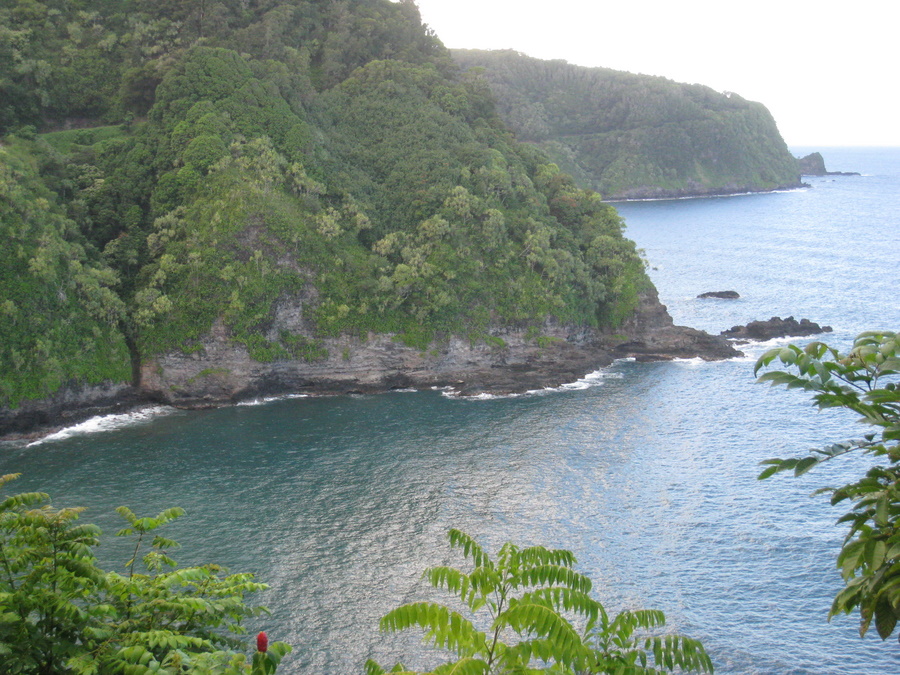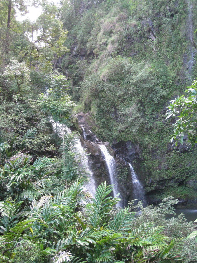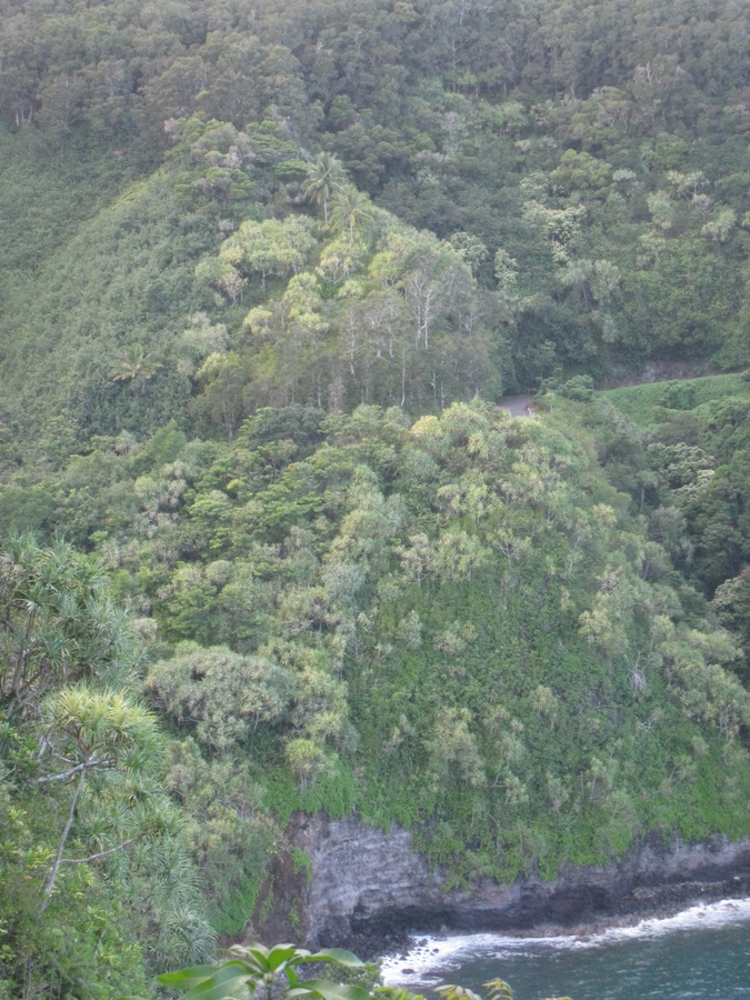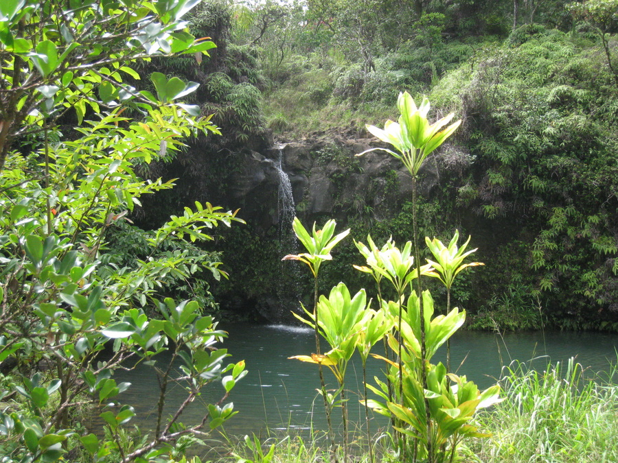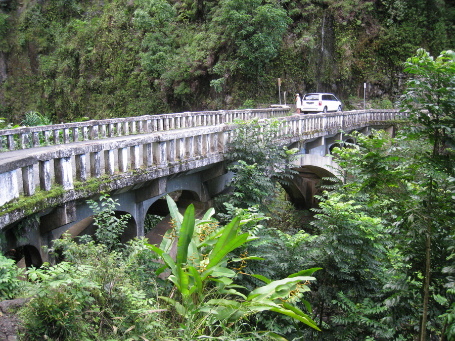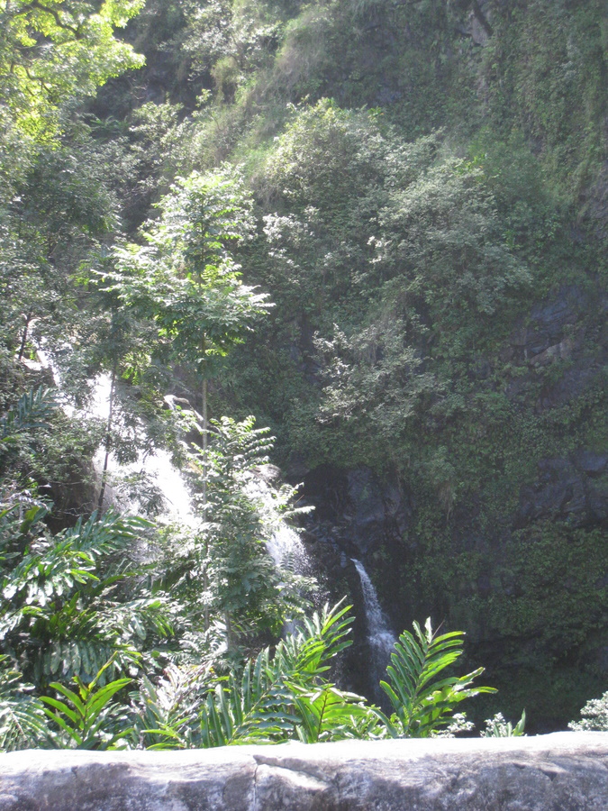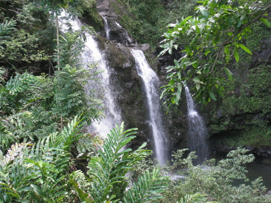 Fredag morgen chekkede vi ud fra vores skønne hotel og kørte sydpå. Vi havde besluttet os at køre til Hana. Det er ikke selve Hana by der er attraktionen, men vejen der til. Det er meget små og meget snoede veje over utallige små broer. Turen er på ca 110 km, så det tager det meste af dagen. ”Road to Hana” er et meget populært turistmål, og vi havde et kort og en CD i bilen, der fortalte om hvad vi så, og om hvornår vi skulle gøre stop. Det var rigtig fint med en ”guide”. Vi er der langs en af de mest regnfulde kyststrækninger i verden, så der var rigtig meget flot natur. Dog var der på denne årstid ikke så meget vand i vandfaldene.