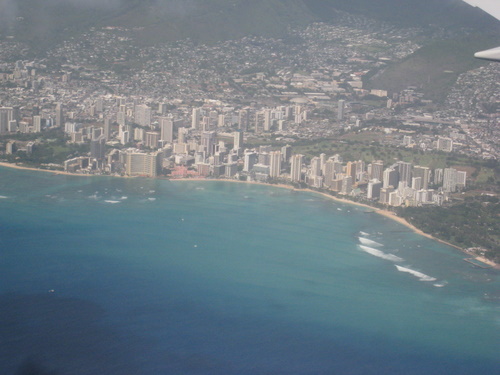 Søndag morgen var der afgang til lufthavnen, hvor vi via Honolulu fløj hjem til San Jose. Da vi lettede fra Honolulu fik vi et sidste view af Hawaii og Waikiki Beach på Oahu.