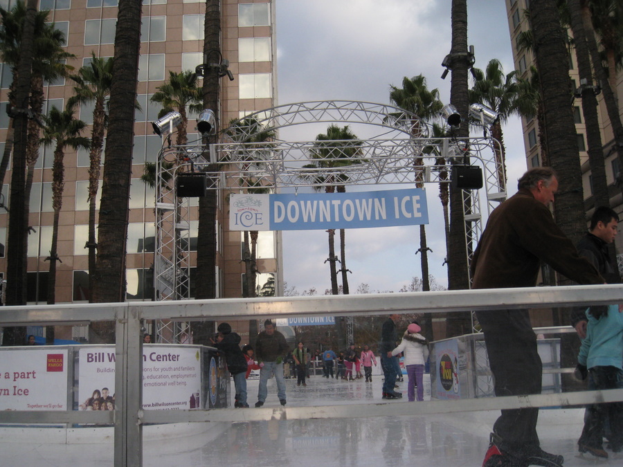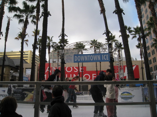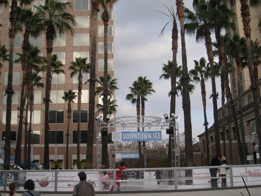 Bagved parken var der lavet en skøjtebane - om aftenen er der lys i palmerne og det ser rigtig flot ud. Lidt specielt med en skøjtebane med palmer!