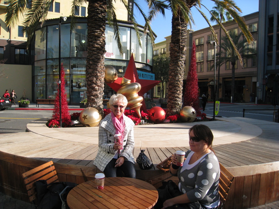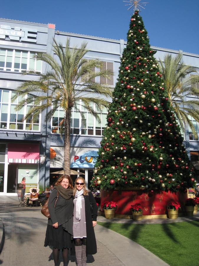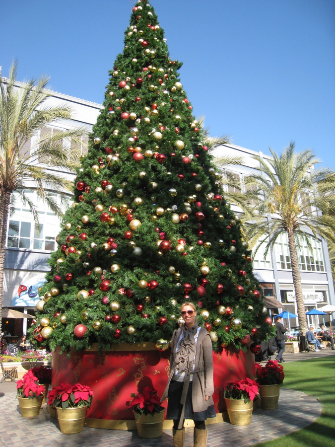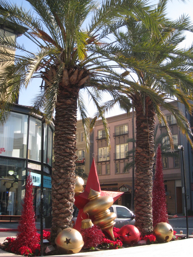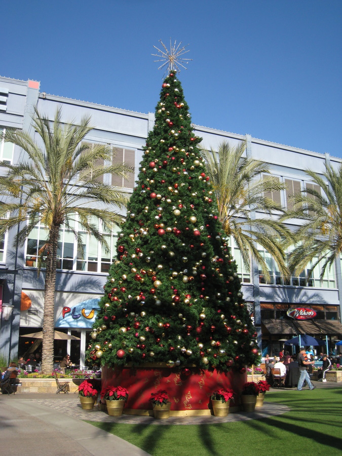 Santana Rows juletræ - ved siden af palmerne! Man kan stadig nyde en kop kaffe udendørs, hvis man finder en plads i solen.