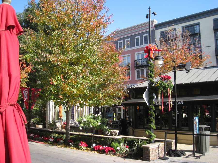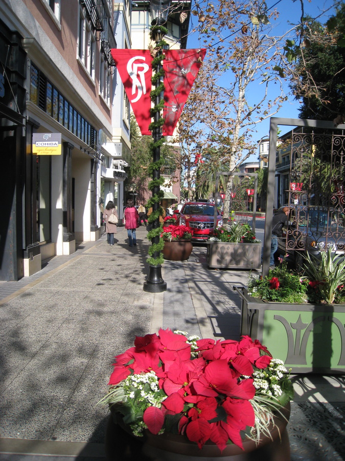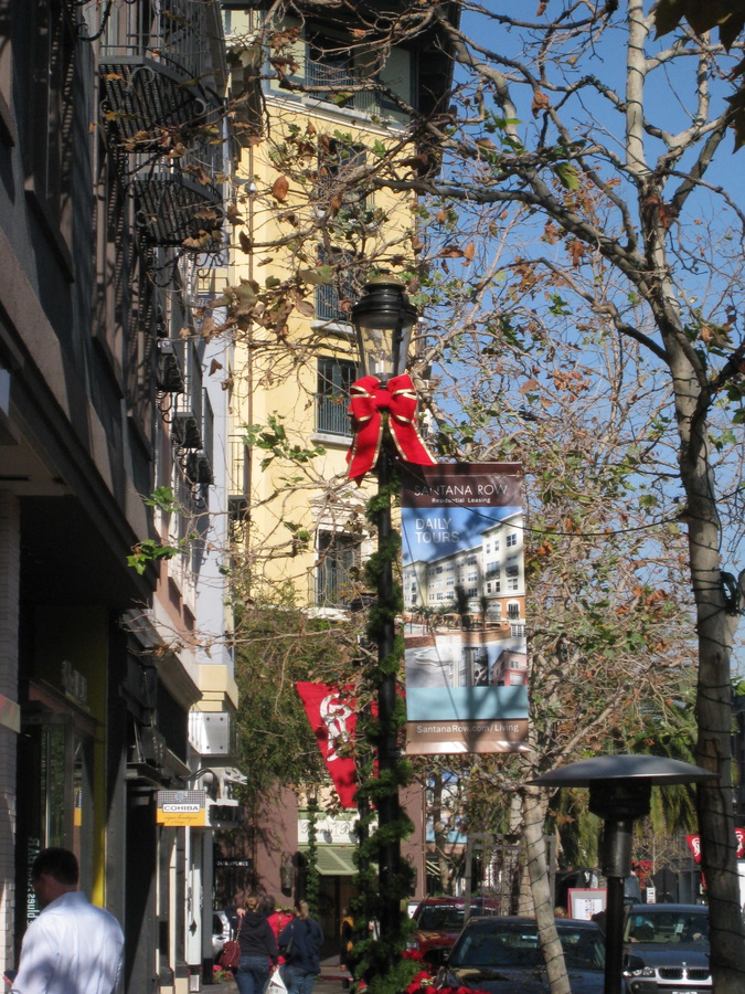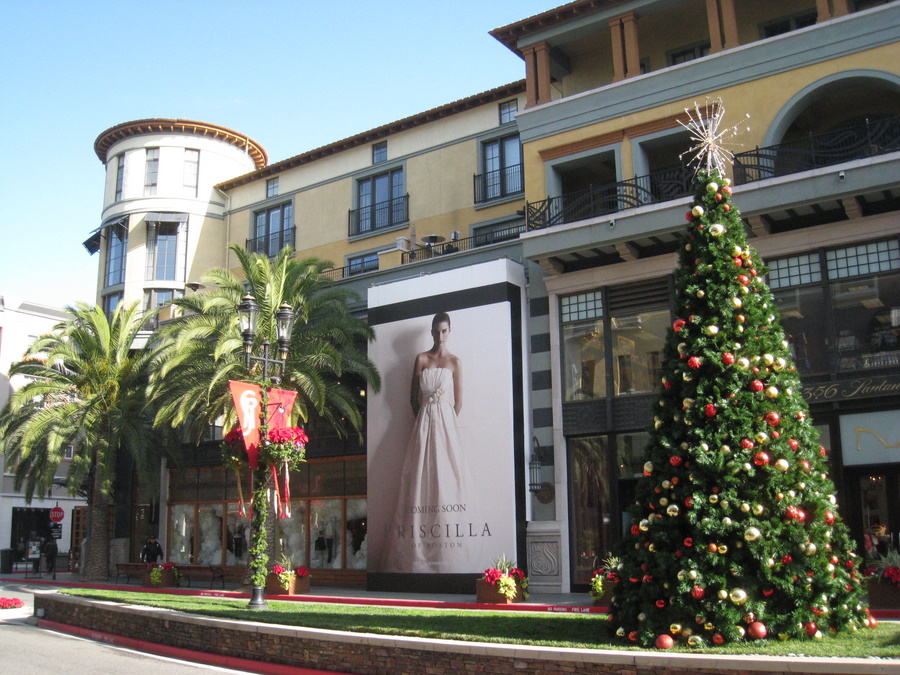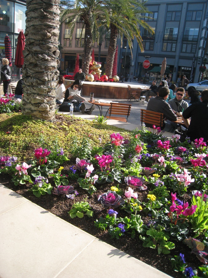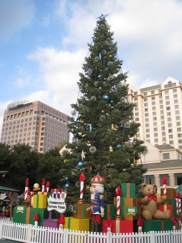 Santana Rows juletræ - ved siden af palmerne! Man kan stadig nyde en kop kaffe udendørs, hvis man finder en plads i solen.