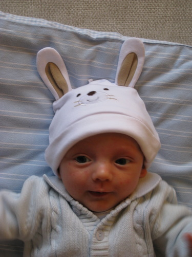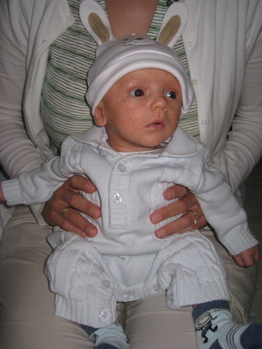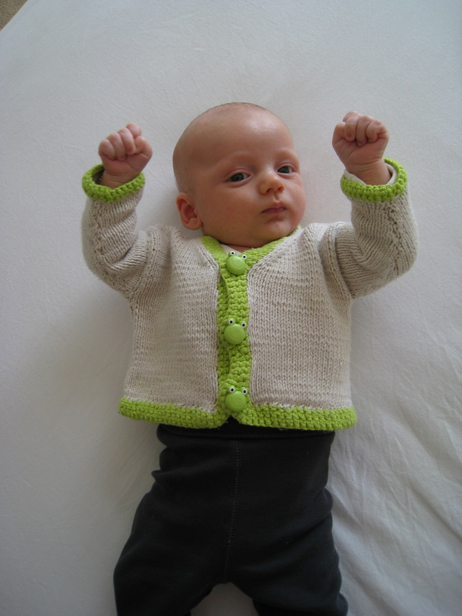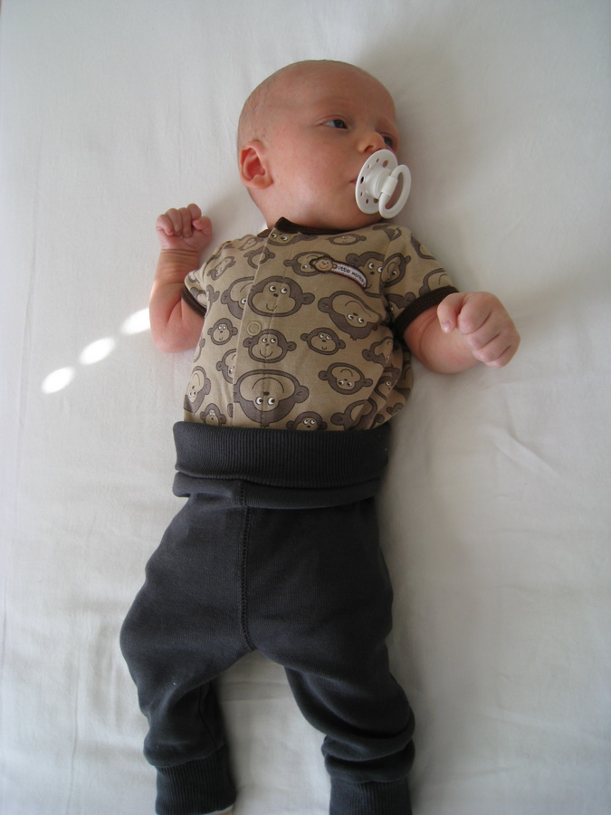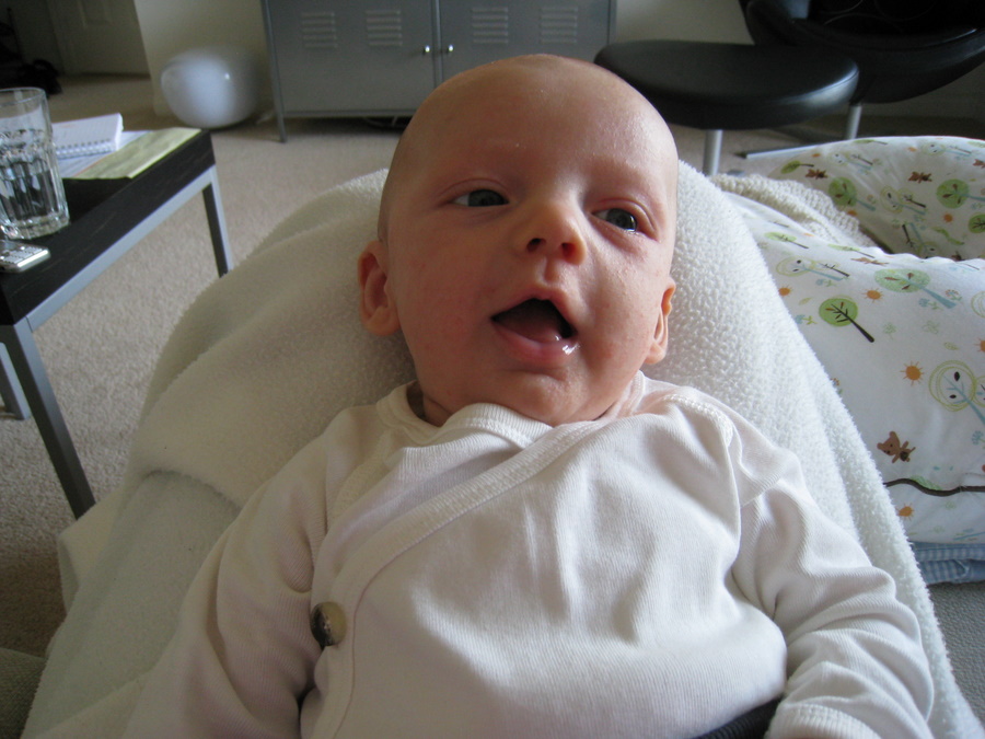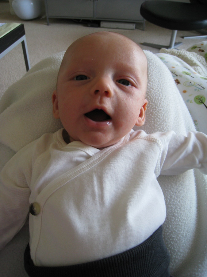 Mads har fået et ”aktivitetscenter”, som vi købte for det gavekort Hans havde fået af sine kollegaer. Mads synes det er sjovt at ligge under det og kigge – specielt fordi der er rødt og gult lys der blinker i toppen og musik der spiller. Han kan endnu ikke række ud efter tingene, men kan få meget tid til at gå med at kigge på dem – og grine og ”snakke” med dem!