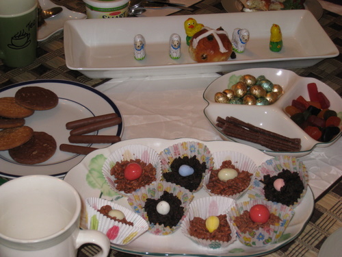 Fredag var Lisa og Mads til påske-formiddagskaffe hos Nikki. Der havde inviteret på Hole-Cross buns (boller med et kors på), som er en speciel engelsk tradition ved påske. Det er boller med appelsinsmag og rosiner i, og som har glasur lavet som et kors på toppen. Ligeledes havde hun lavet rice-crispy påske-kager og lagkage, så der var nok til den søde tand.