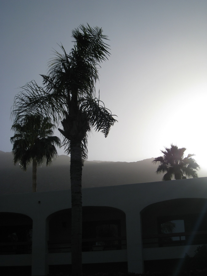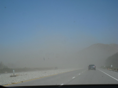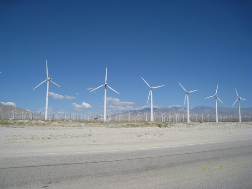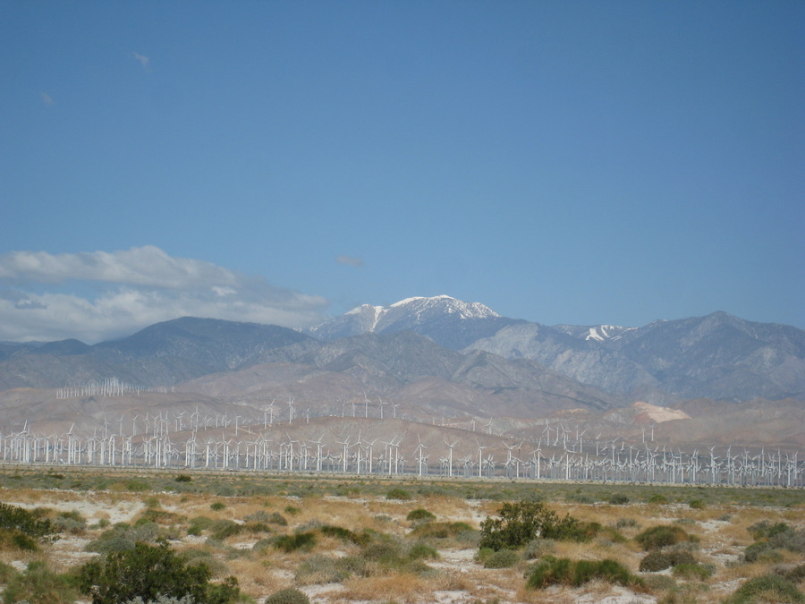 Lige inden vi nåede Palm Springs samlede bjergene sig på begge sider og dalen blev til en tragt. Vi kunne se tusindvis af vindmøller og vi skulle gennem en sandstorm inden vi kom inden for by skiltet Palm Springs.
