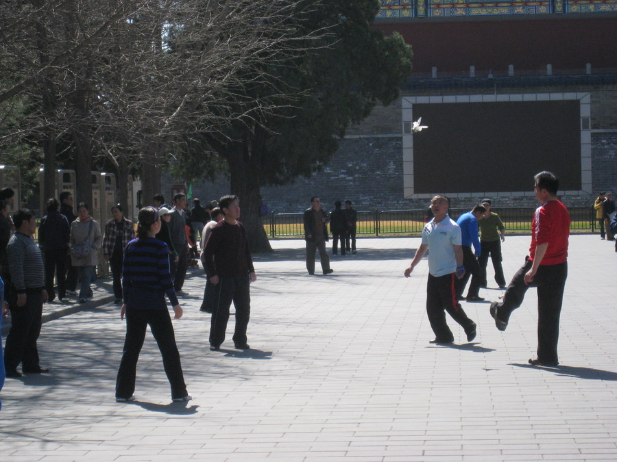 Vi mødte også straks efter ankomsten en stor gruppe dansende folk – nogle dansede med hinanden, andre med sig selv! Lidt længere inde i parken kom vi forbi nogle der sparkede til en slags fjerbold på en helt akrobatisk måde – de må have øvet sig længe! Vi kunne da også se at de gik vældig meget op i dette ”spil”.
