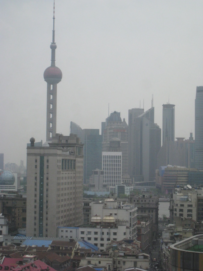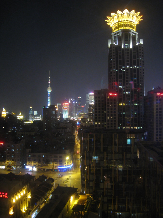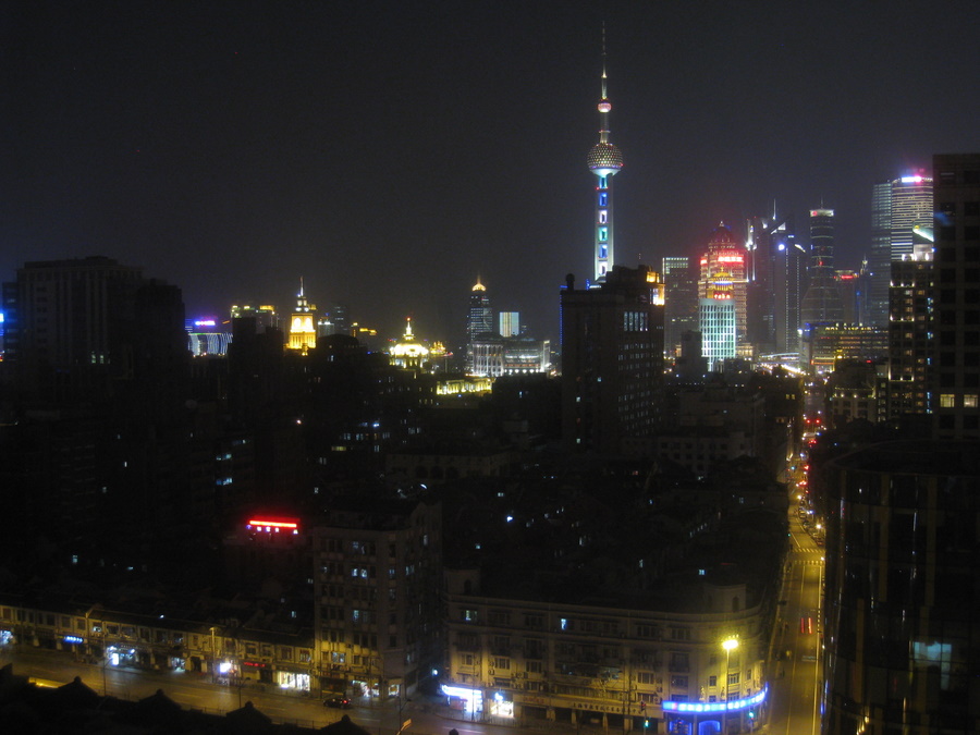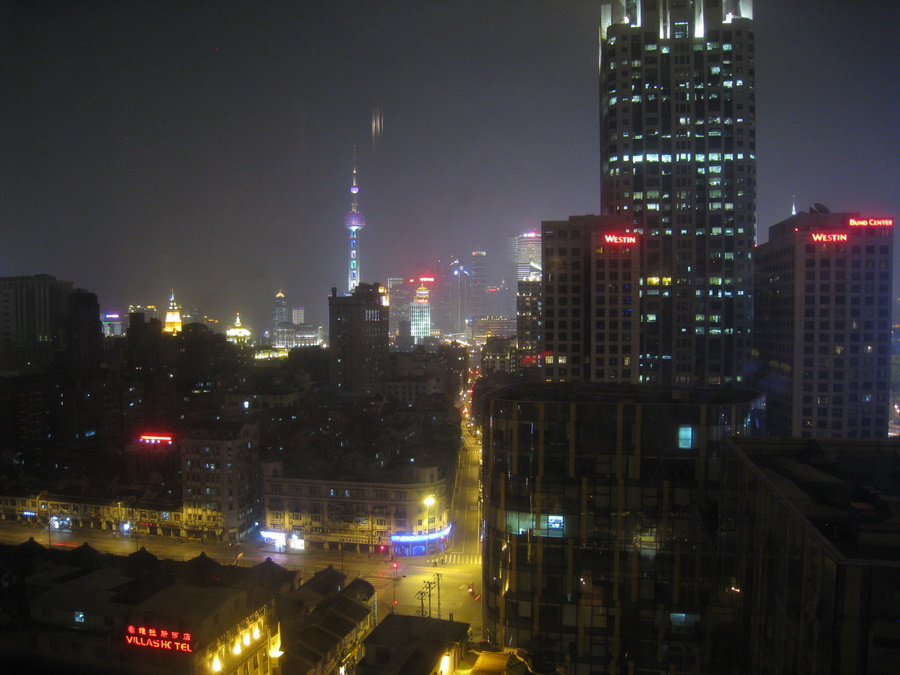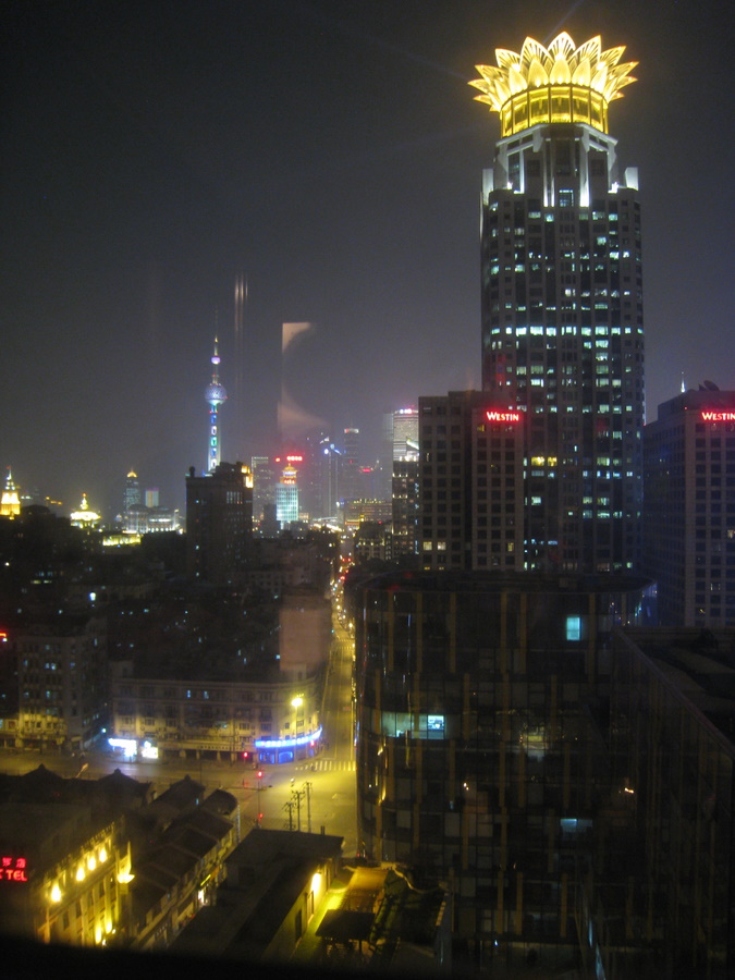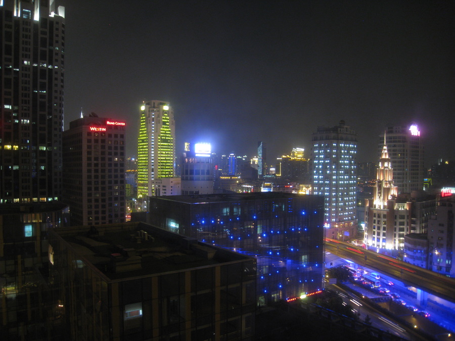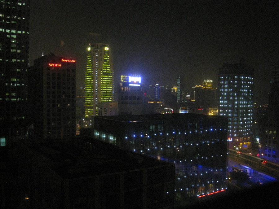 Hotellet som vi havde booket lå i gå afstand til den central del af Shanghai. Selvom det var mørkt da taxien kørte os mod hotellet, kunne vi godt fornemme på alle højhusene med lys i alle farver at det var en moderne storby vi var kommet til. Vores værelse lå højt oppe med en udsigt til floden Huangpu over mod Pudong.