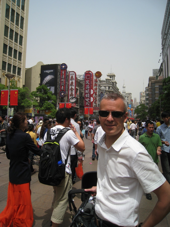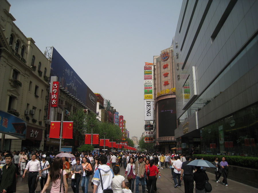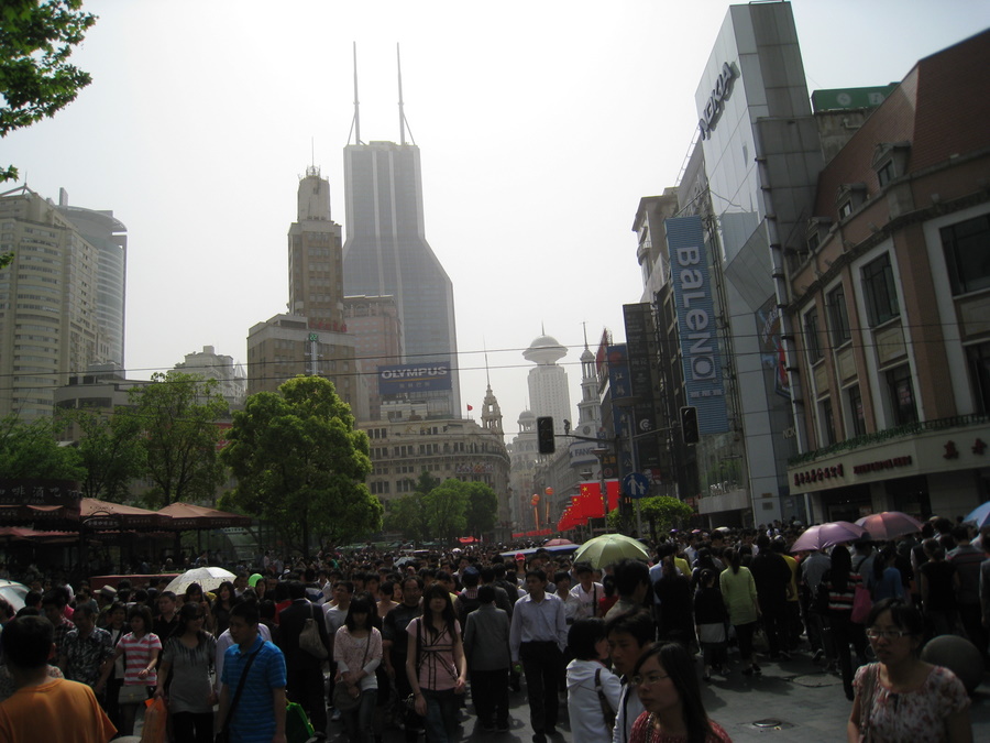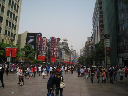 I den ene ende af parken starter gaden Nanjing, som er en bred gade omdannet til gågade. Her er alle de berømte modehuse repræsenteret. Da vi gik en tur ned af ”strøget” føltes det som om alle de mennesker vi så dagen før på The Bund var fulgt efter os – det var tæt pakket med mennesker!