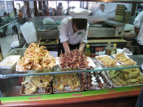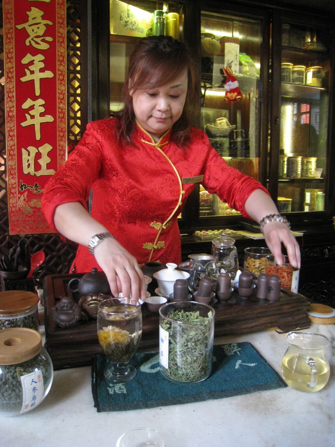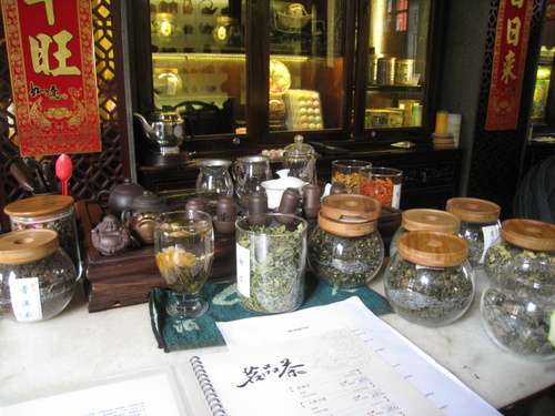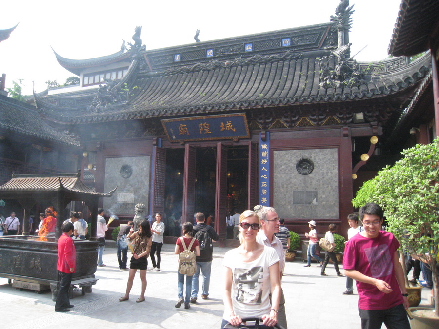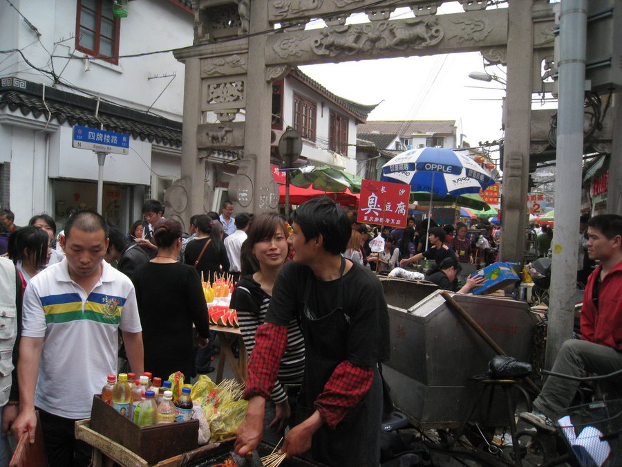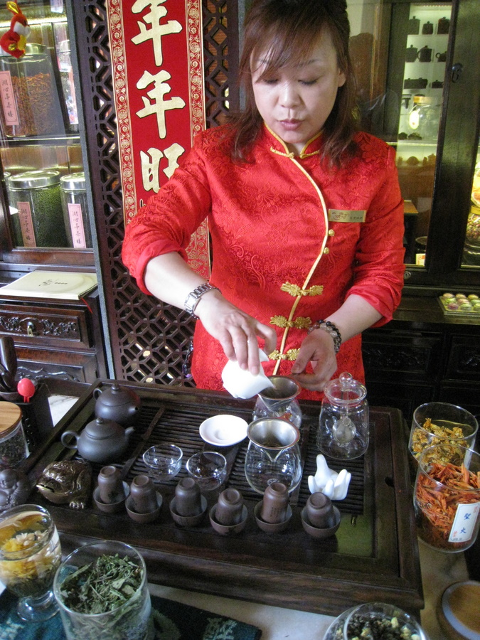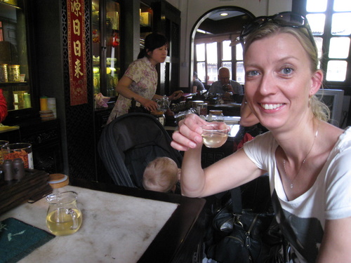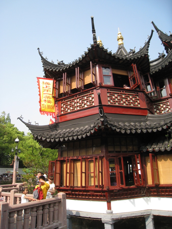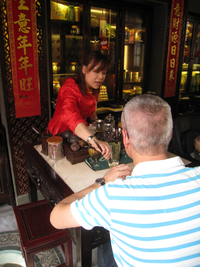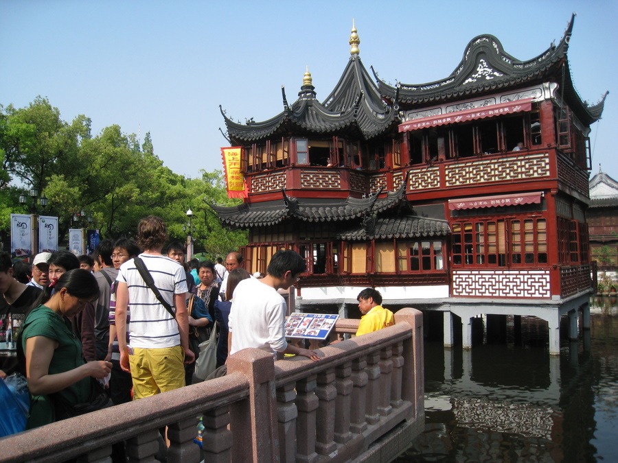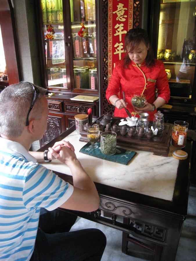 Huxinting te-hus er Shanghais mest berømte te-hus bygget i 1784, hvor samtlige prominente udenlandske gæster – fra Hillary og Bill Clinton til Dronning Elizabeth har nydt en kande te – og nu også os! Man kommer over til te-huset via ”De Ni Svings Bro”, som er zig-zagget for ifølge kinesisk tradition kan de onde ånder kun bevæge sig i lige linier. Da vi kom indenfor og ”bestilt” bord troede vi egentlig bare, at vi ville få en kande te. Men nej, vi blev henvist til et specielt bord, hvor der var mange forskellige typer te i glasskåle. En dame fortale om de forskellige typer, hvor de kom fra, hvad de bestod af, hvor gamle de var osv. Da vi havde valgt 2 forskellige typer, fortalte hun om te-brygge-metoden – først skal te’en skoldes, for bl.a. at rense og blødgøre te’en og den ”bryg” skulle ikke drikkes. Dernæst bryggede hun te’en til os ad flere gange, da den sagtens kunne genbruges adskillige gange. Alt i alt en spændende oplevelse på et historisk sted, og vi fik en masse information om te vi ikke vidste.