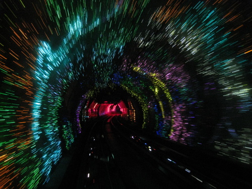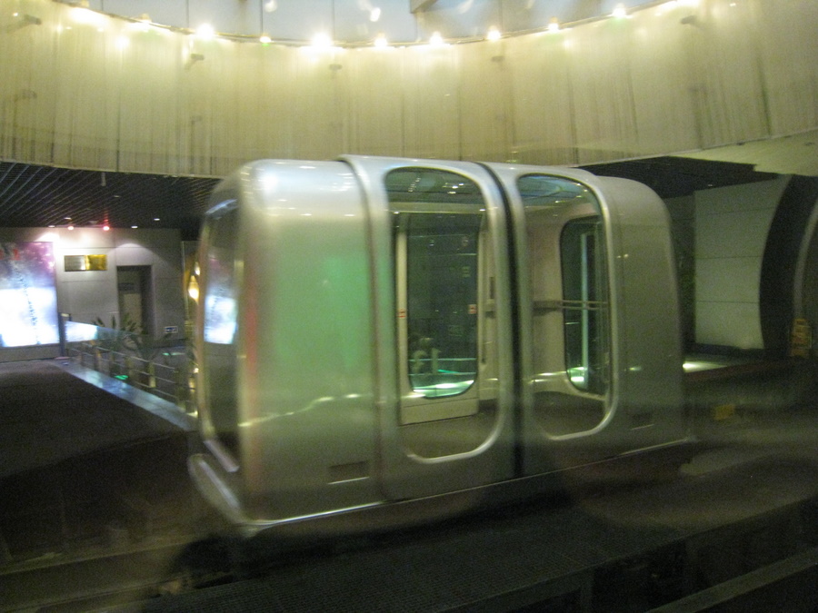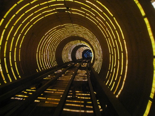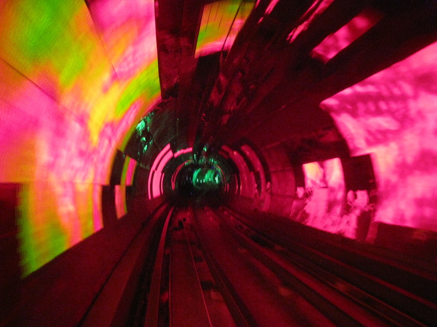 Selvom vejret var lidt gråt, ville vi en tur op i TV tårnet som ligger i Pudong. Der var flere muligheder for at krydse floden så vi valgte Bund Sightseeing Tunnel. Man bliver kørt under floden i små tog-vogne i Bund Sightseeing Tunnel, hvor selve tunnelen er oplyst af et lysorgie i alverdens farver med tilhørende musik.