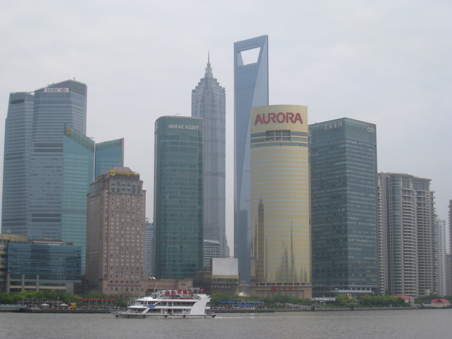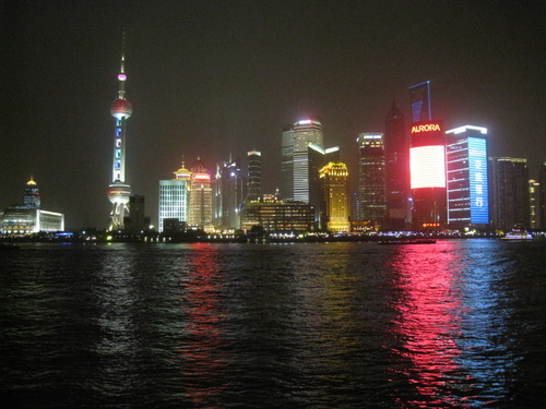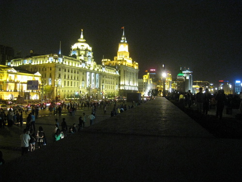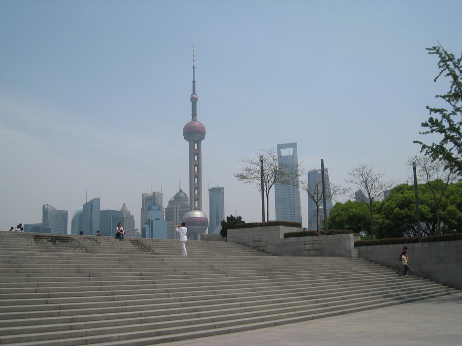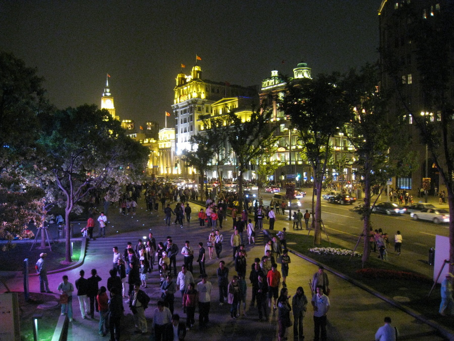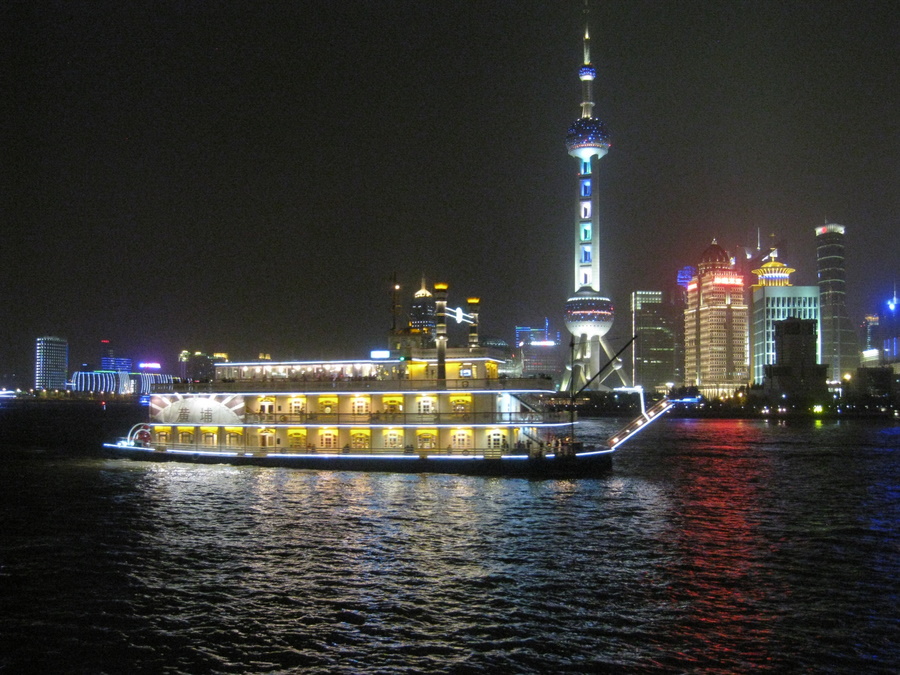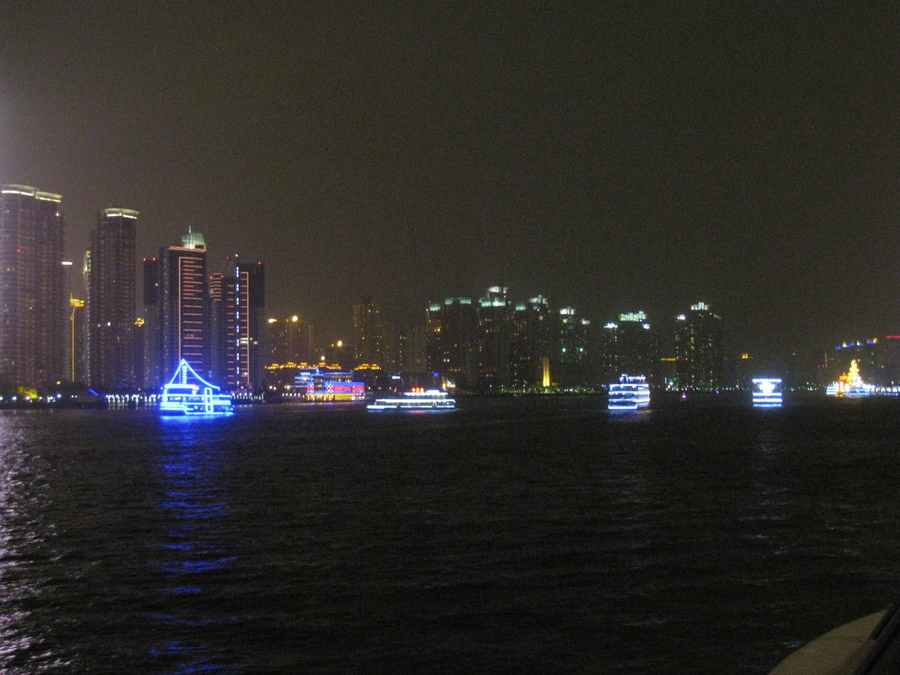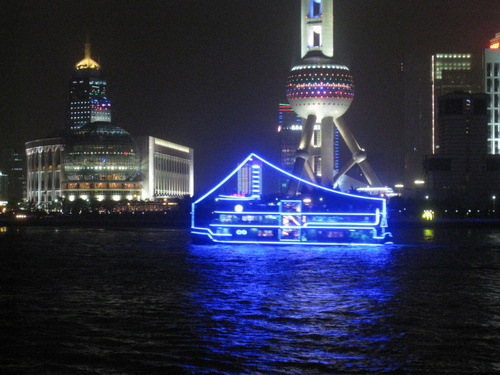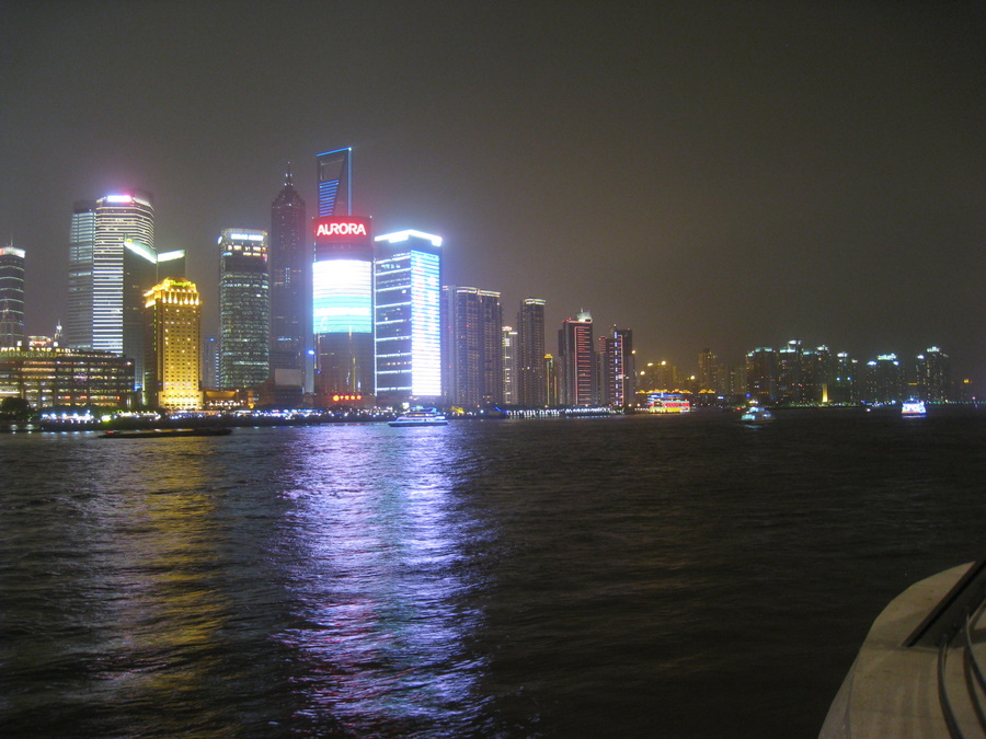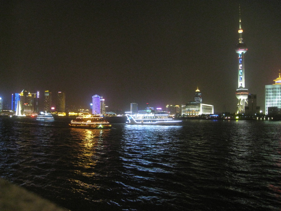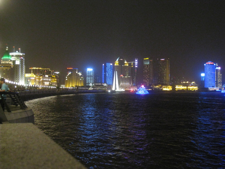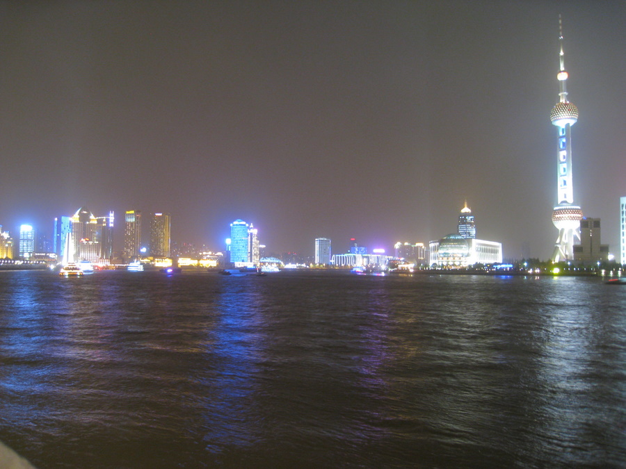 På den anden side af floden ligger Pudong, som i 1990 kun var rismarker og er nu gigantiske skyskraber med det glimtende TV tårn (Oriental Pearl TV Tower), som det mest iøjnefaldende varetegn. Om aftnen er der neon lys på alle skyskraberne og nogle endda med kæmpe store reklame skærme. Tur-bådene er også oplyst af mange farver når mørket falder på.