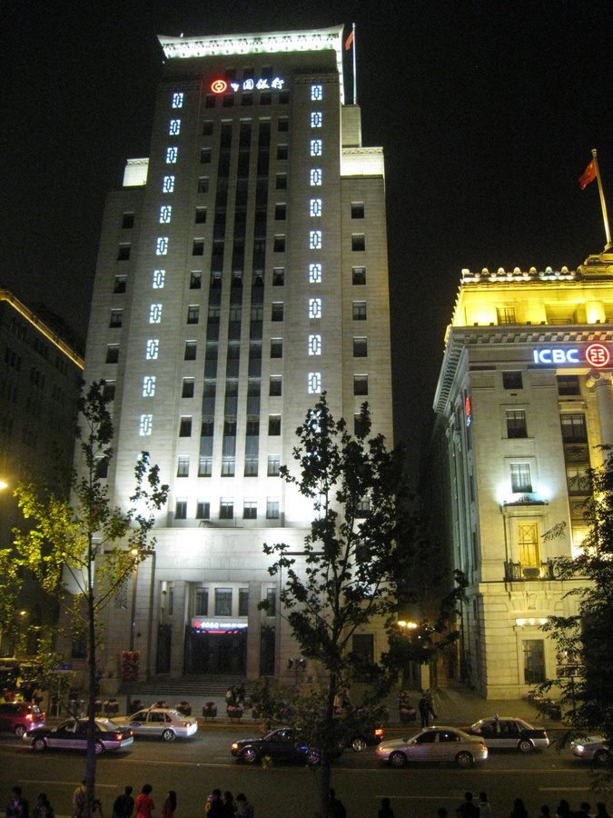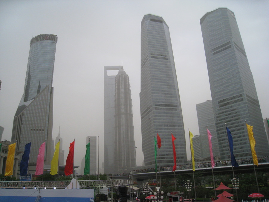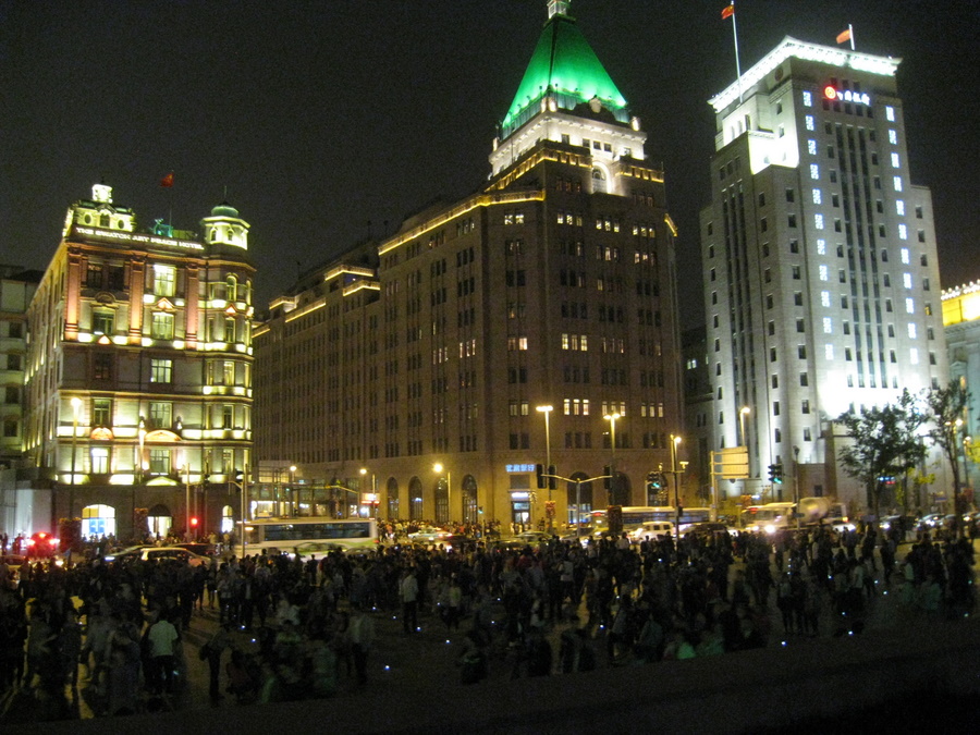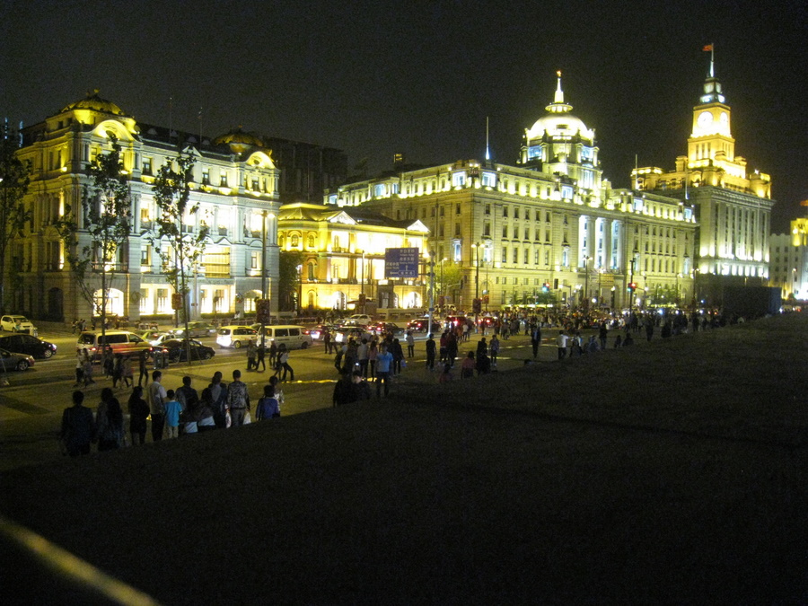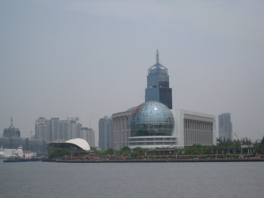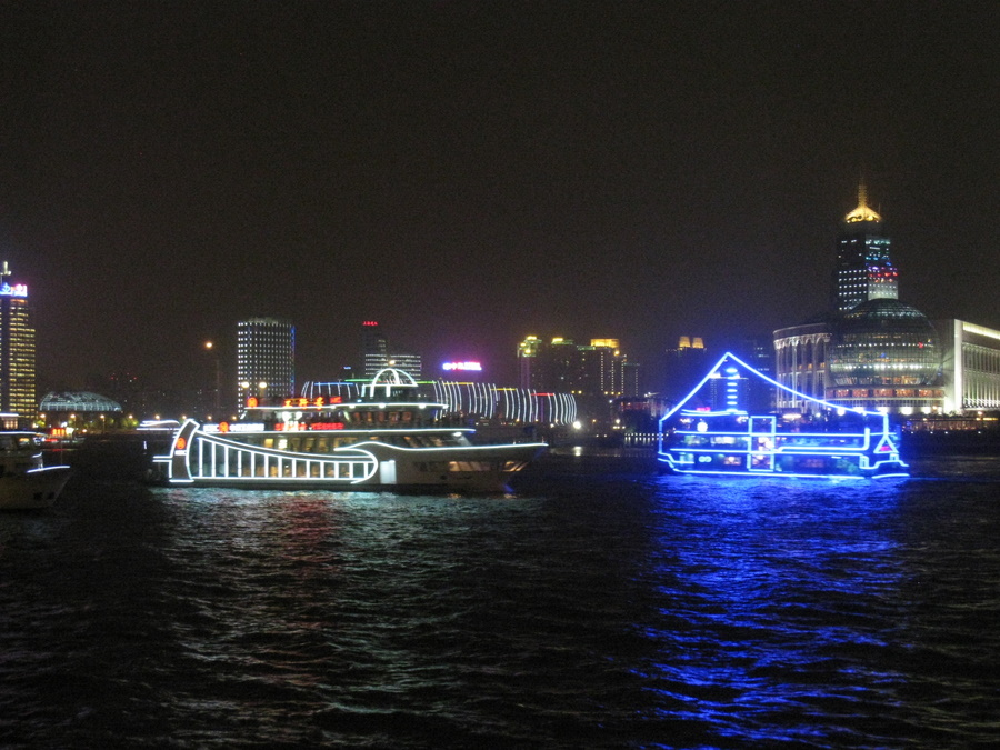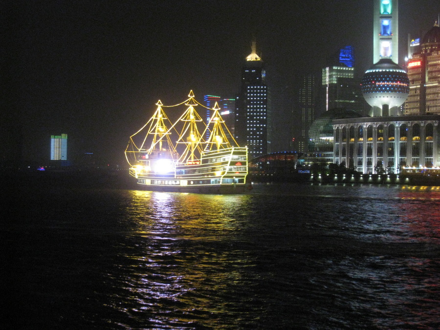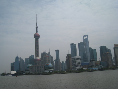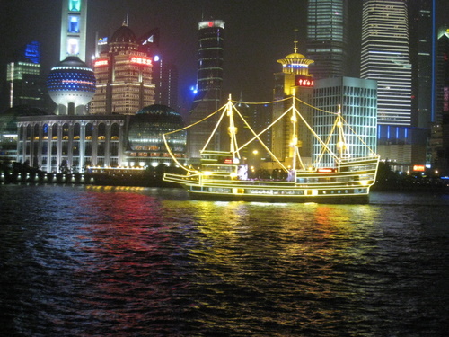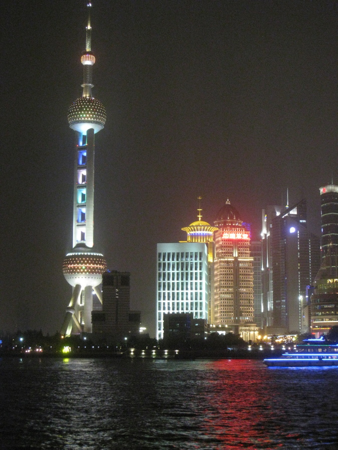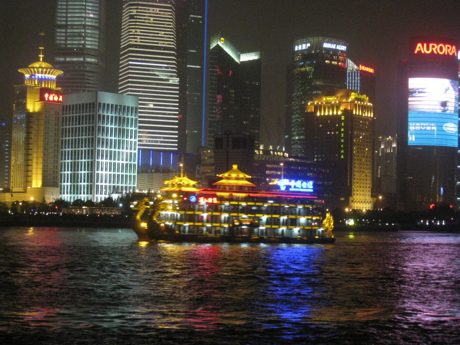 På den anden side af floden ligger Pudong, som i 1990 kun var rismarker og er nu gigantiske skyskraber med det glimtende TV tårn (Oriental Pearl TV Tower), som det mest iøjnefaldende varetegn. Om aftnen er der neon lys på alle skyskraberne og nogle endda med kæmpe store reklame skærme. Tur-bådene er også oplyst af mange farver når mørket falder på.