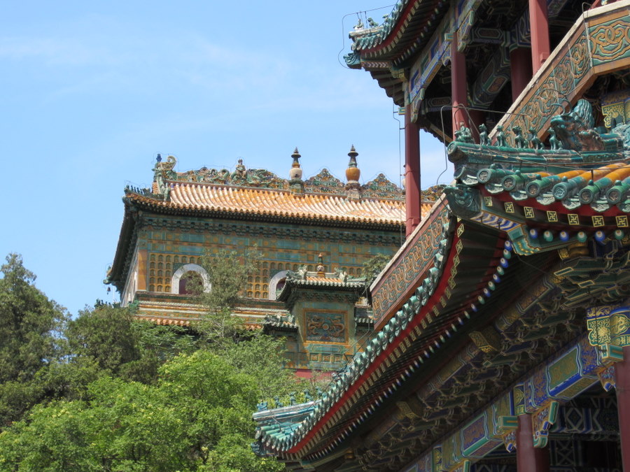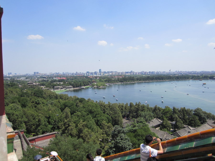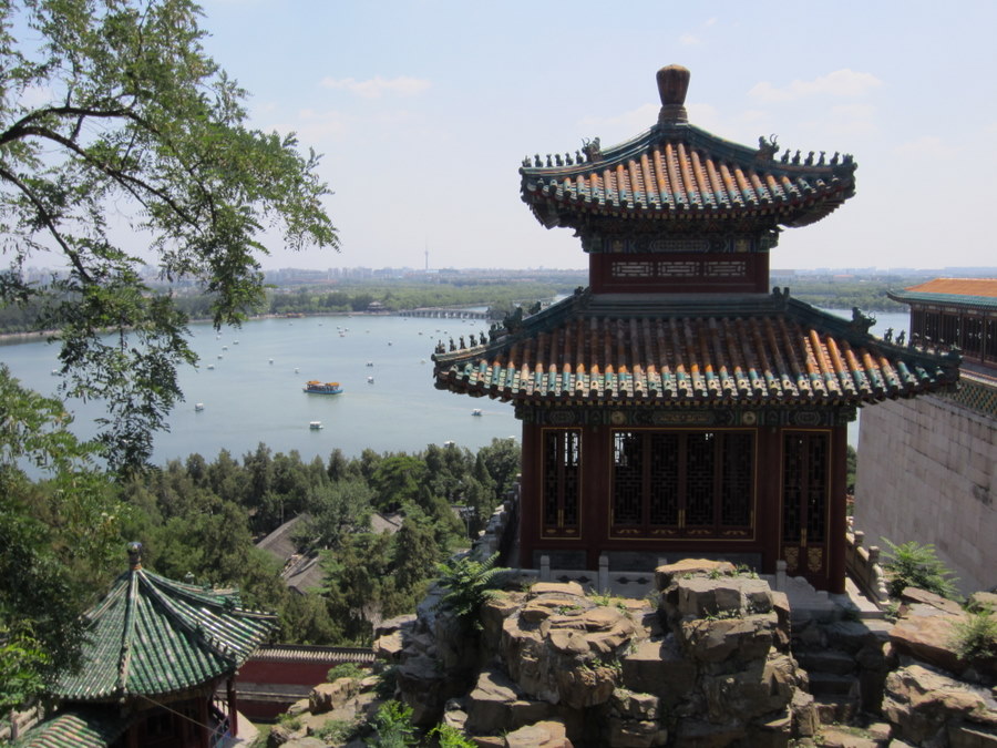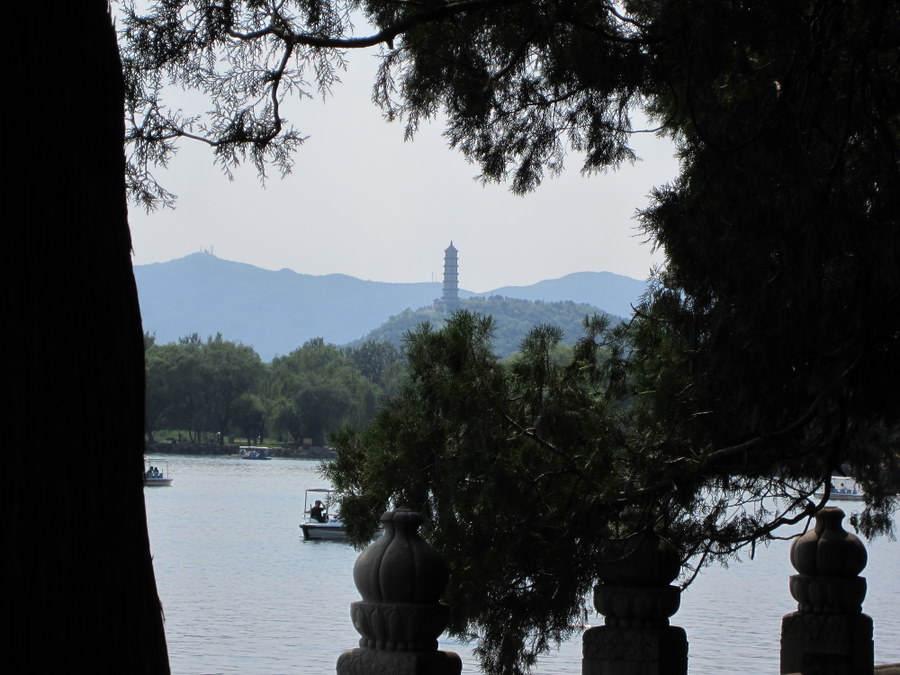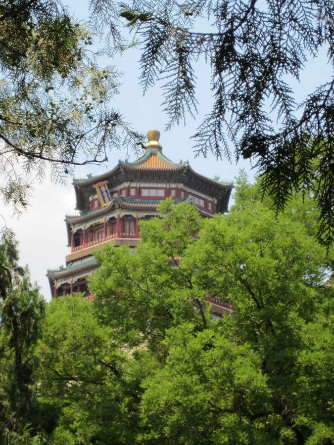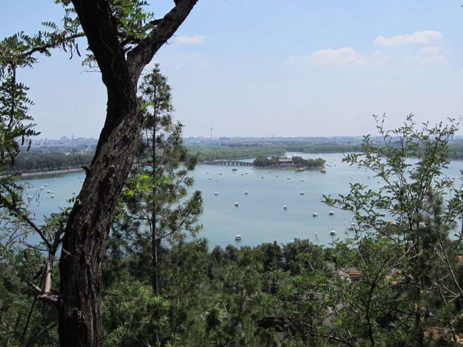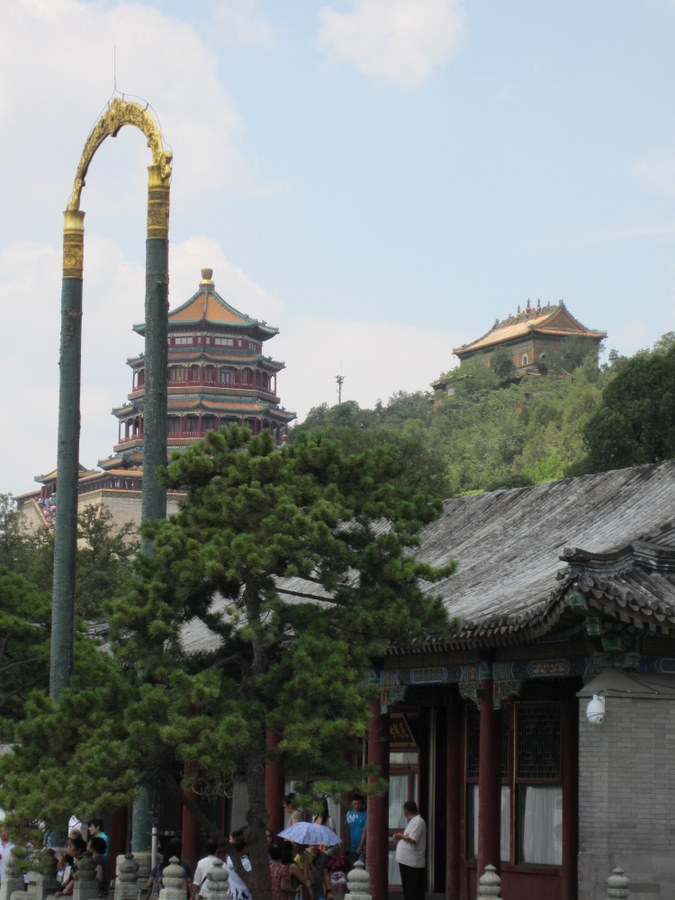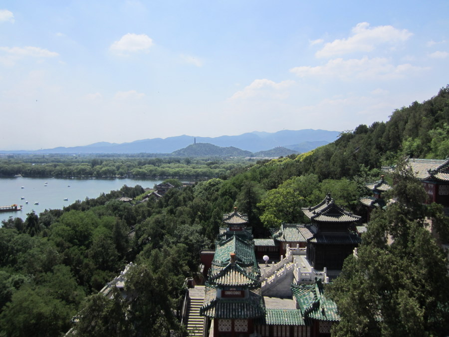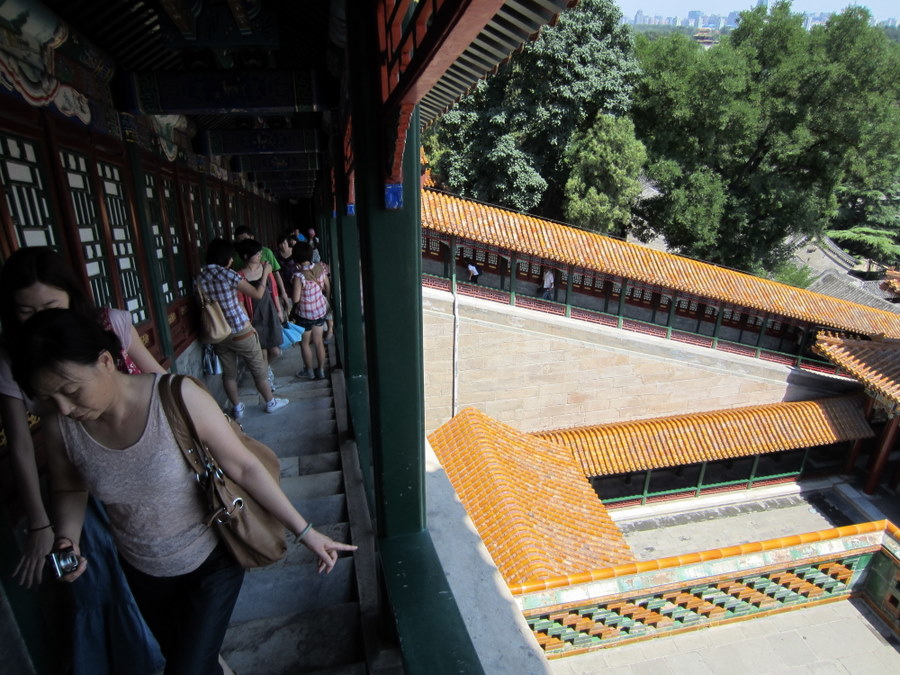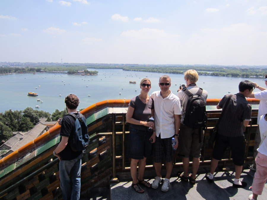 Efter vi havde nydt vores medbragte rugbrøds madpakker med spegepølse, gik Lisa, Hugo og Hans op mod Det Lange Livs Pavillon, mens Irma blev med Mads tilbage ved søbredden. Da Kunming søen blev gravet ud, blev de store mængder jord brugt til at forme højen ved søens nord side. På toppen af højen opførte kejser Qianlong en pavillon til ære for sin mors 60 års fødselsdag. Ved siden af pavillonen er der også opført et tempel med en statue af den mangearmede boddhisatva Guanyin. Her oppe fra templet er der en fantastisk udsigt ud over Sommerpaladset, Kunming søen og ind mod Beijing.