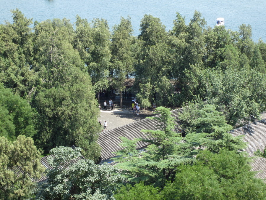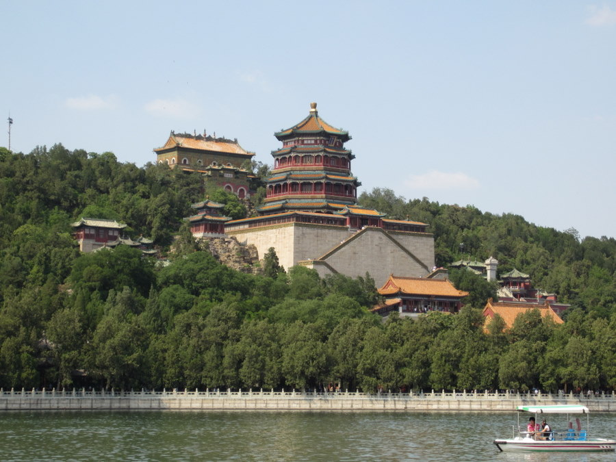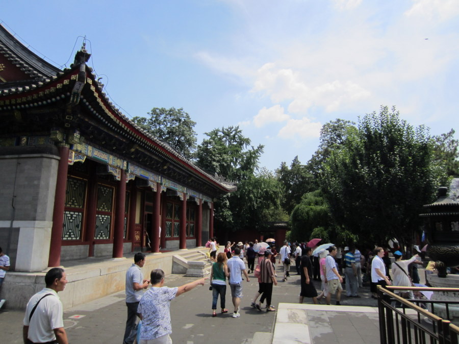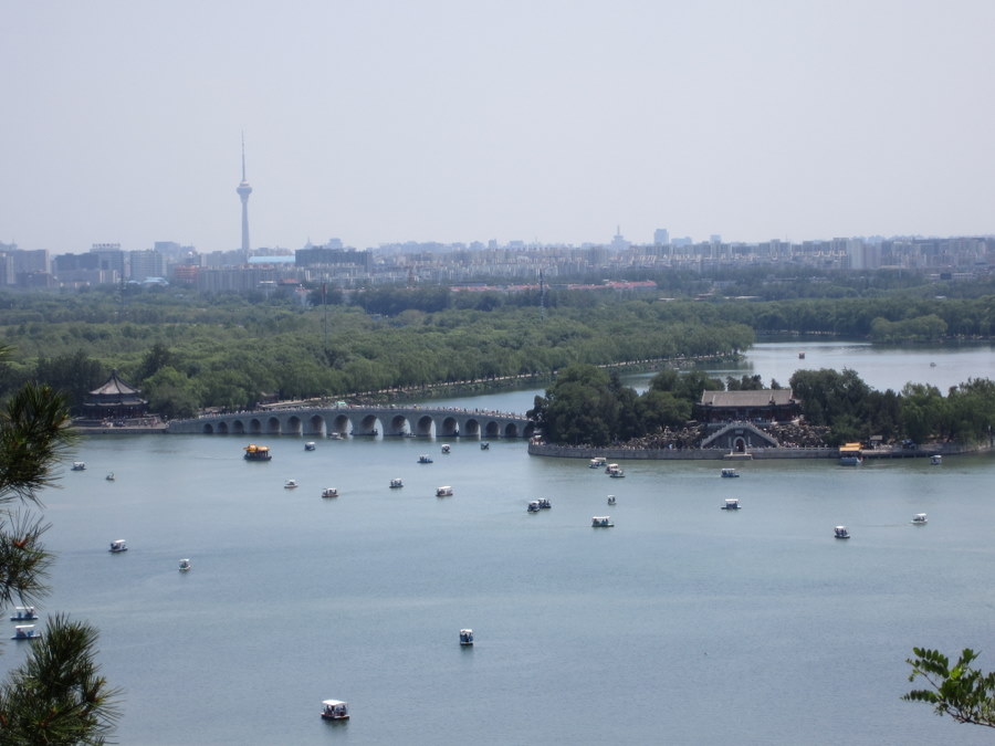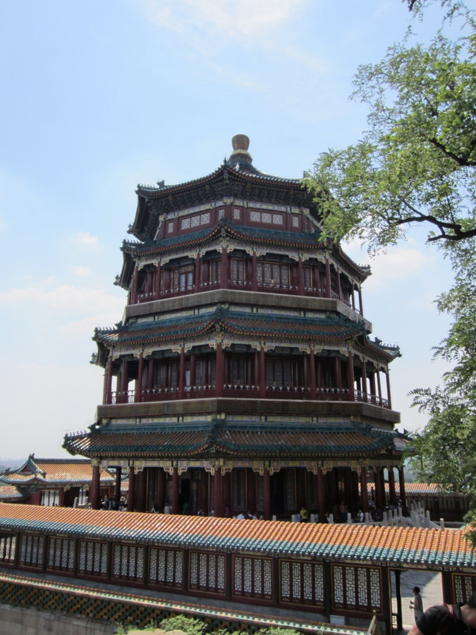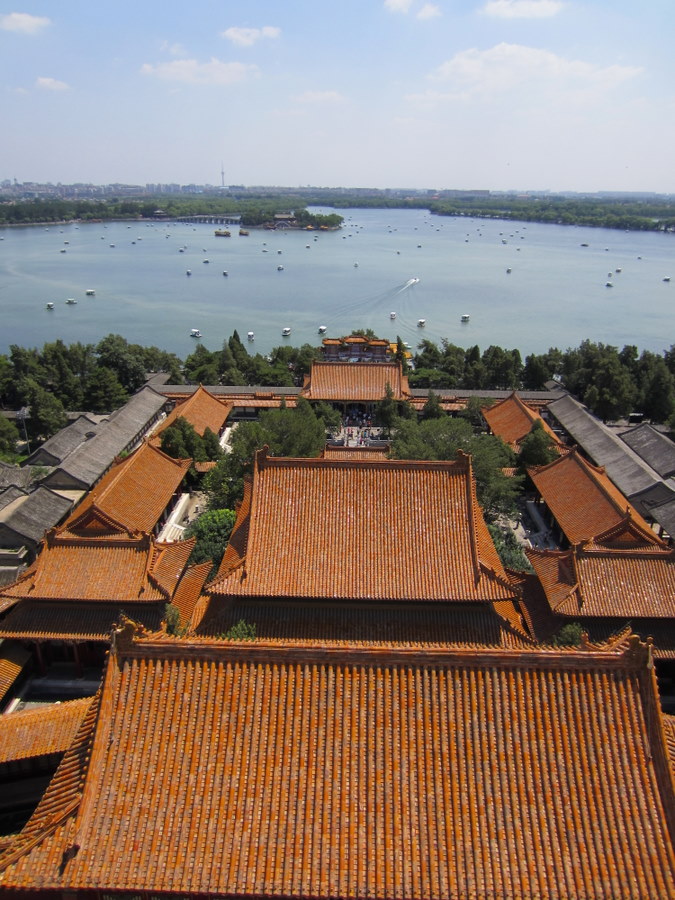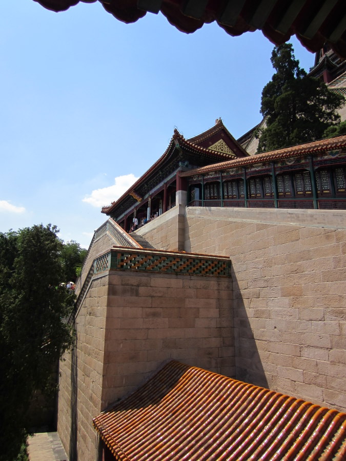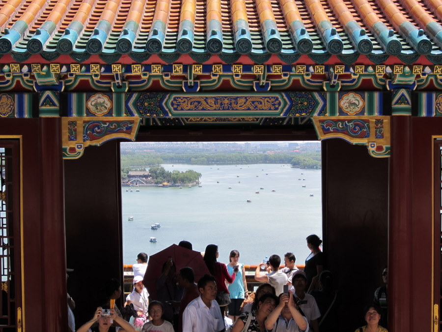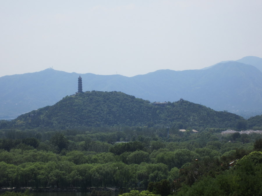 Efter vi havde nydt vores medbragte rugbrøds madpakker med spegepølse, gik Lisa, Hugo og Hans op mod Det Lange Livs Pavillon, mens Irma blev med Mads tilbage ved søbredden. Da Kunming søen blev gravet ud, blev de store mængder jord brugt til at forme højen ved søens nord side. På toppen af højen opførte kejser Qianlong en pavillon til ære for sin mors 60 års fødselsdag. Ved siden af pavillonen er der også opført et tempel med en statue af den mangearmede boddhisatva Guanyin. Her oppe fra templet er der en fantastisk udsigt ud over Sommerpaladset, Kunming søen og ind mod Beijing.