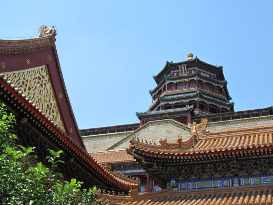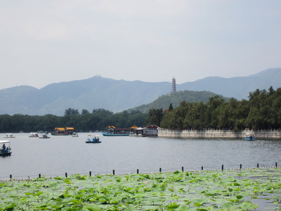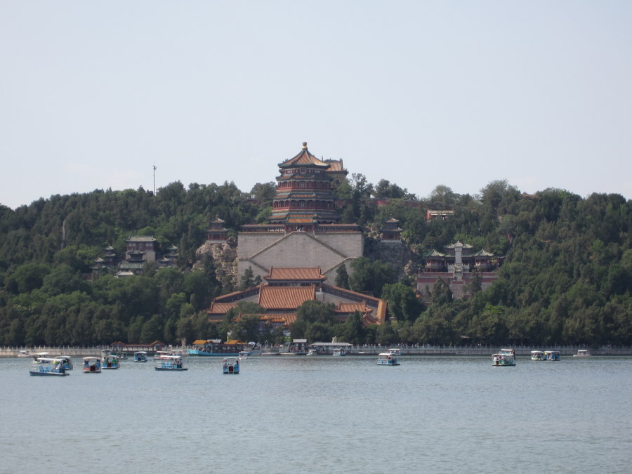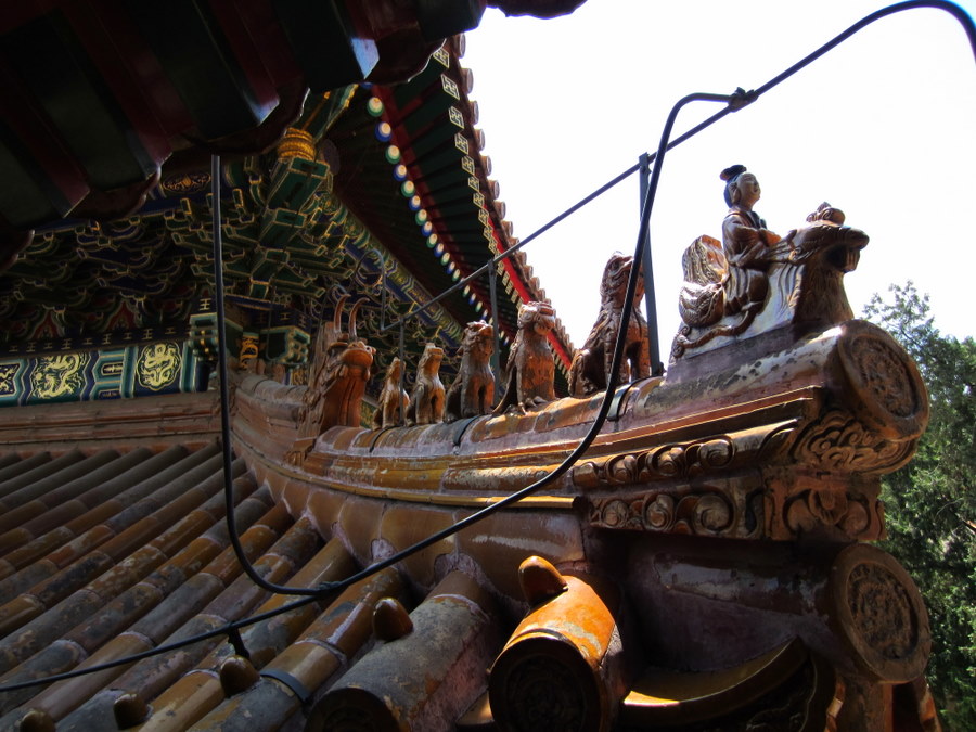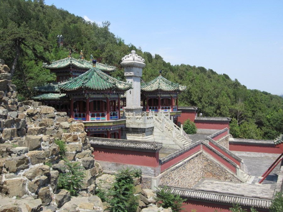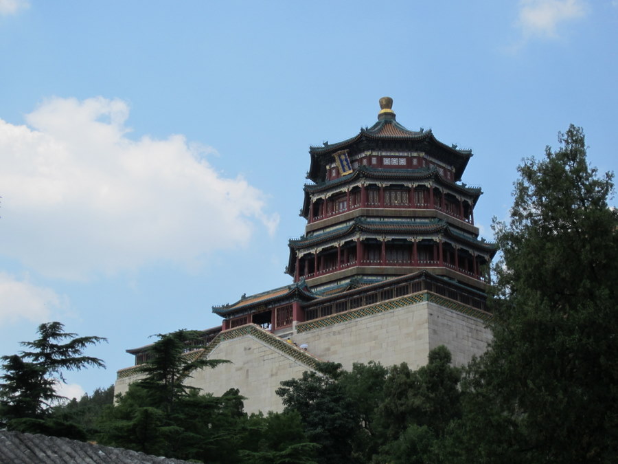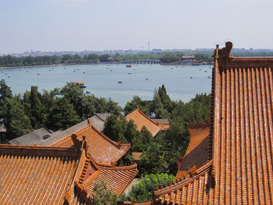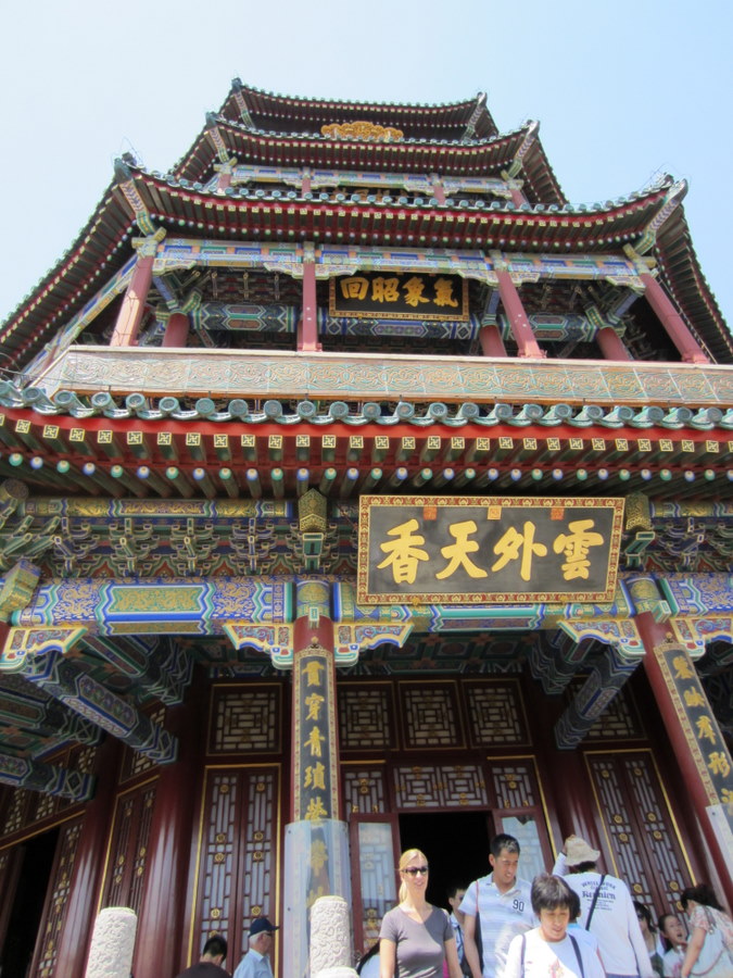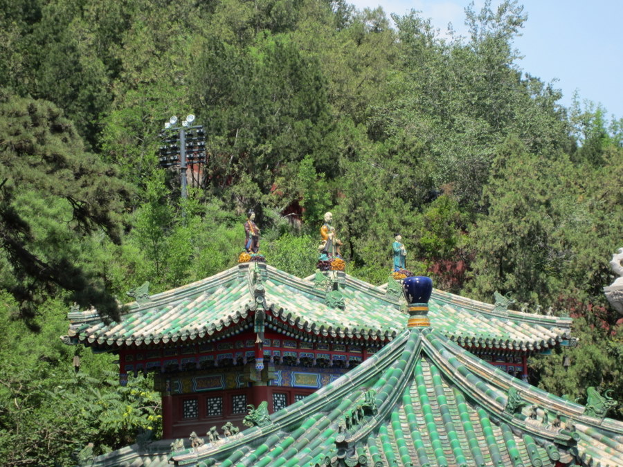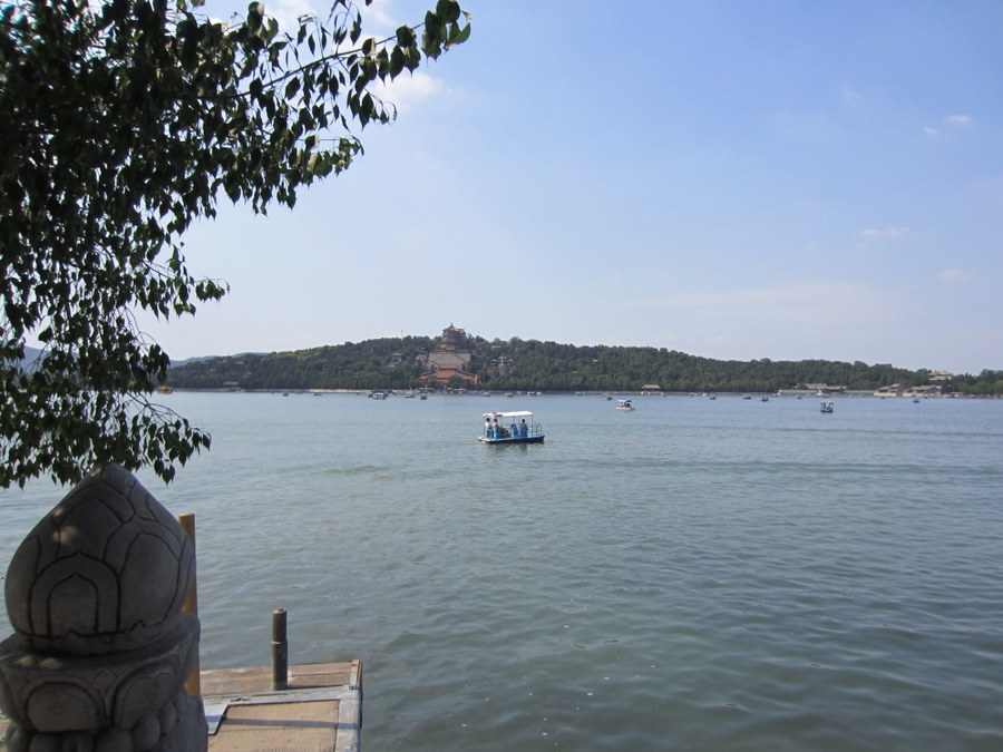 Efter vi havde nydt vores medbragte rugbrøds madpakker med spegepølse, gik Lisa, Hugo og Hans op mod Det Lange Livs Pavillon, mens Irma blev med Mads tilbage ved søbredden. Da Kunming søen blev gravet ud, blev de store mængder jord brugt til at forme højen ved søens nord side. På toppen af højen opførte kejser Qianlong en pavillon til ære for sin mors 60 års fødselsdag. Ved siden af pavillonen er der også opført et tempel med en statue af den mangearmede boddhisatva Guanyin. Her oppe fra templet er der en fantastisk udsigt ud over Sommerpaladset, Kunming søen og ind mod Beijing.