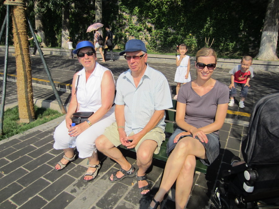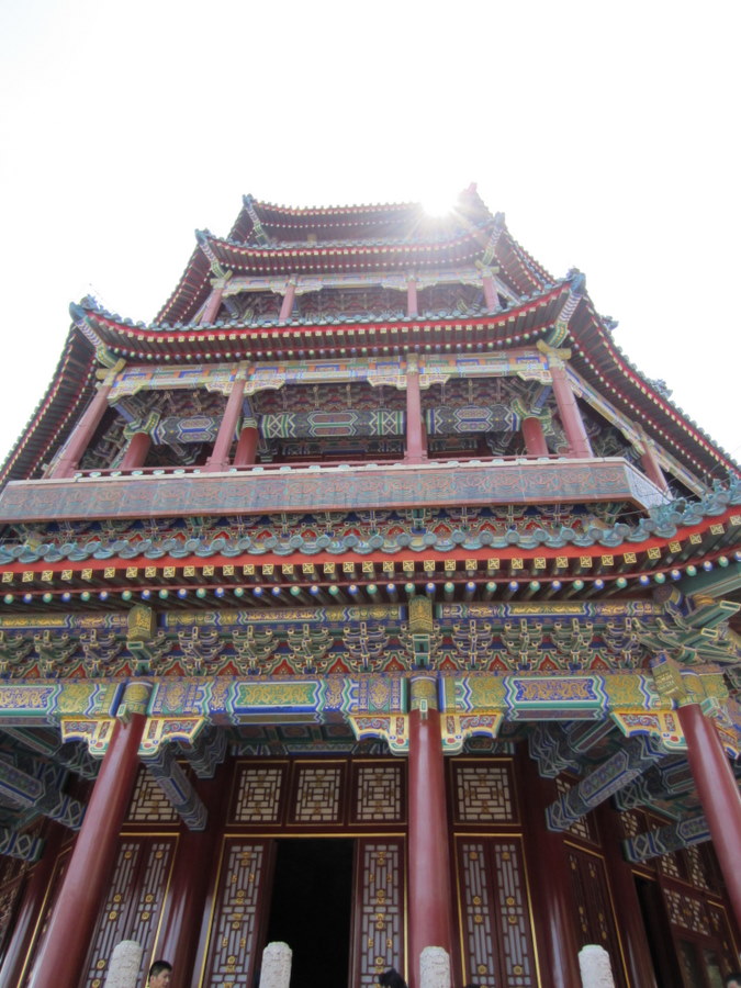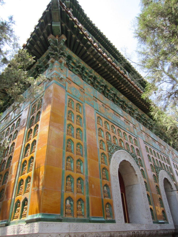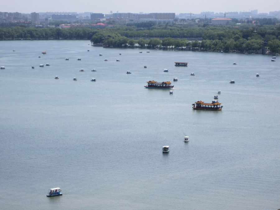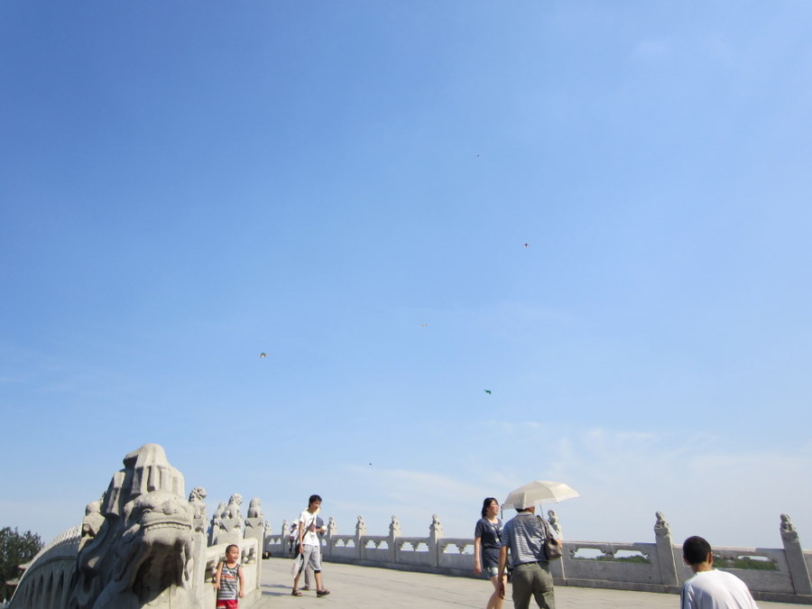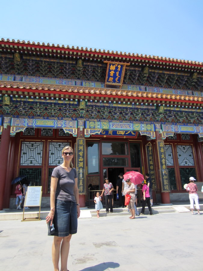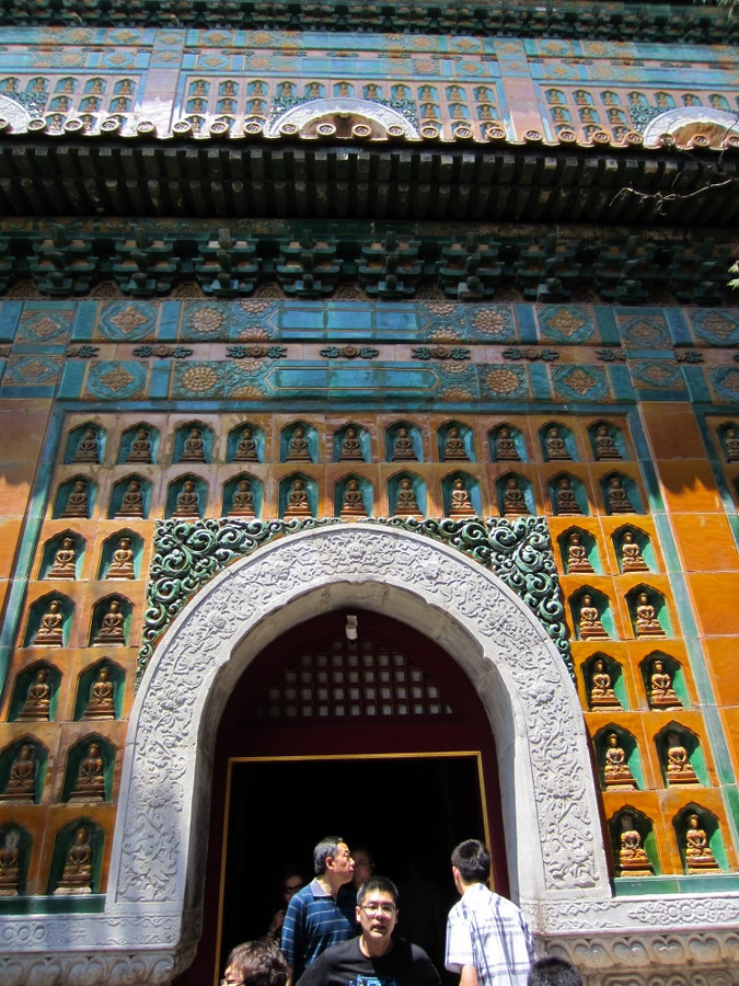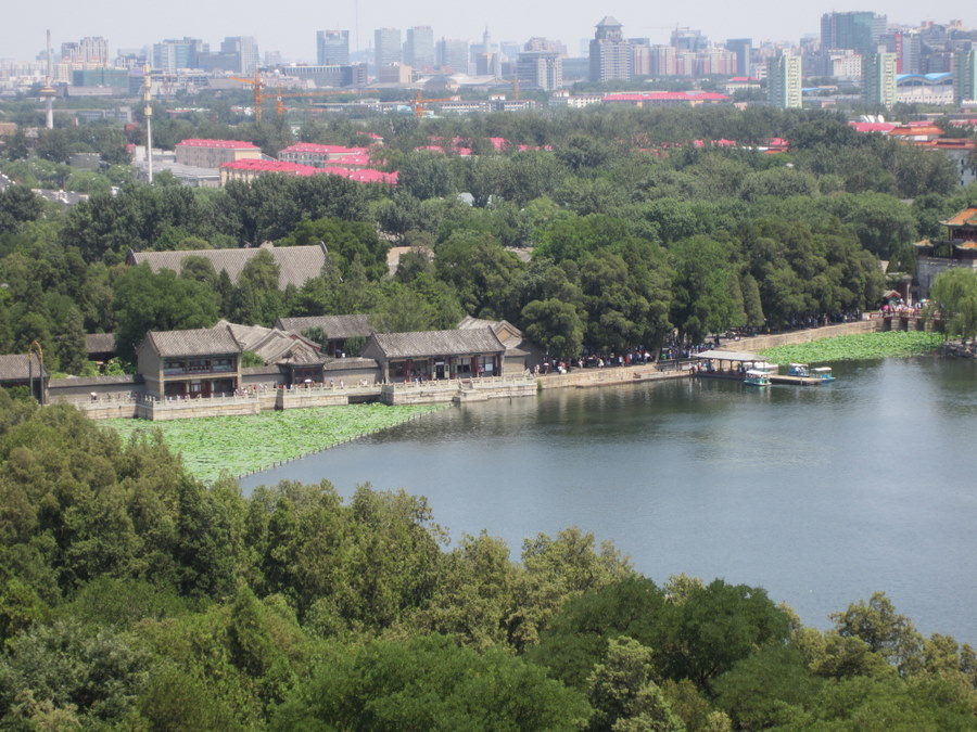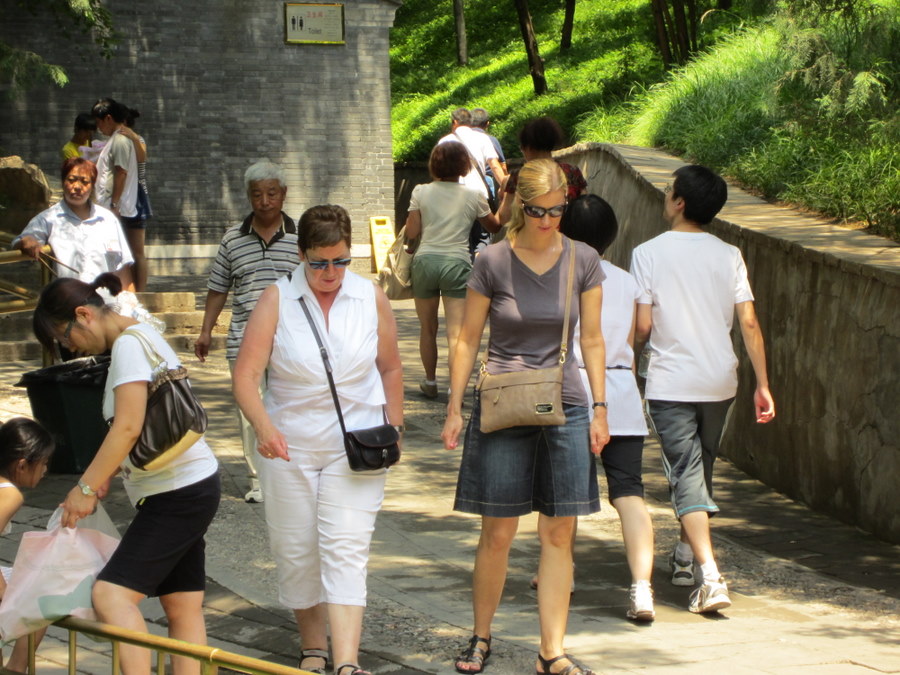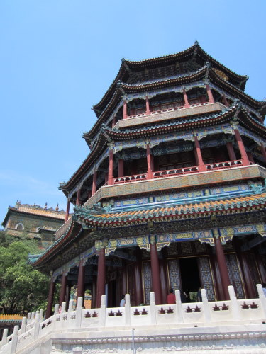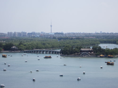 Efter vi havde nydt vores medbragte rugbrøds madpakker med spegepølse, gik Lisa, Hugo og Hans op mod Det Lange Livs Pavillon, mens Irma blev med Mads tilbage ved søbredden. Da Kunming søen blev gravet ud, blev de store mængder jord brugt til at forme højen ved søens nord side. På toppen af højen opførte kejser Qianlong en pavillon til ære for sin mors 60 års fødselsdag. Ved siden af pavillonen er der også opført et tempel med en statue af den mangearmede boddhisatva Guanyin. Her oppe fra templet er der en fantastisk udsigt ud over Sommerpaladset, Kunming søen og ind mod Beijing.