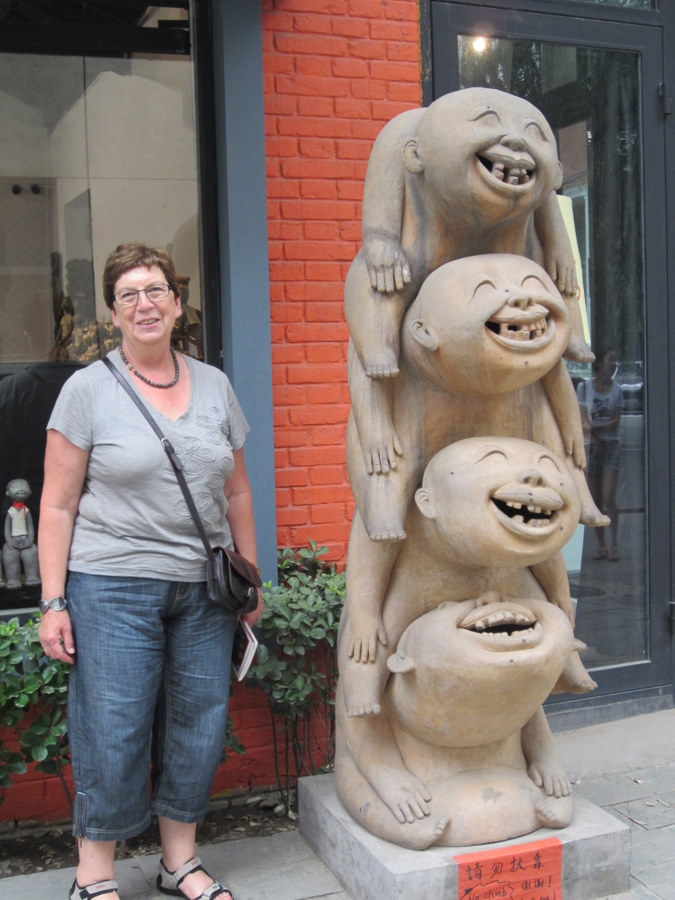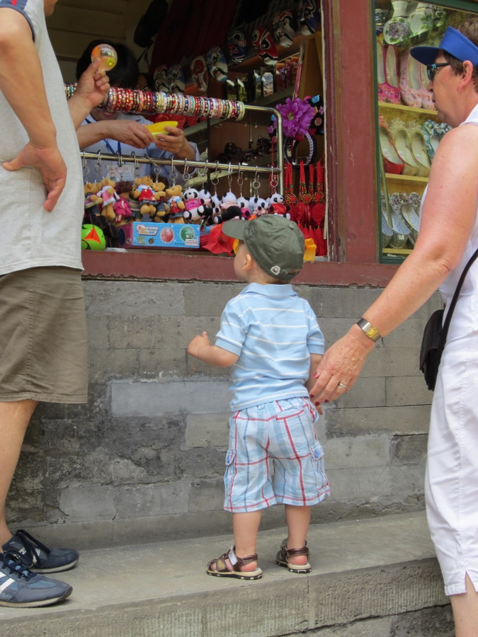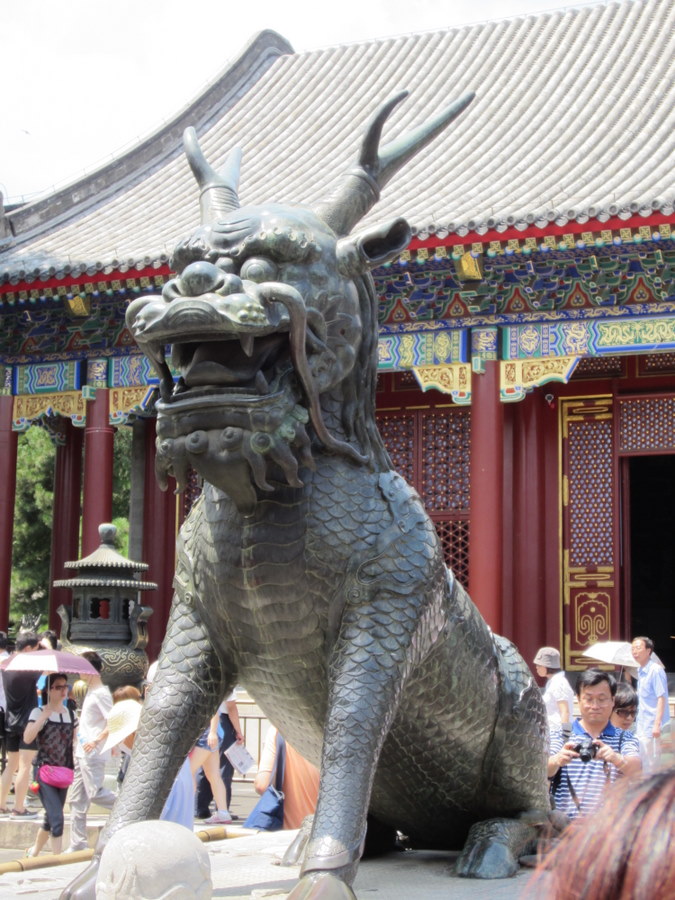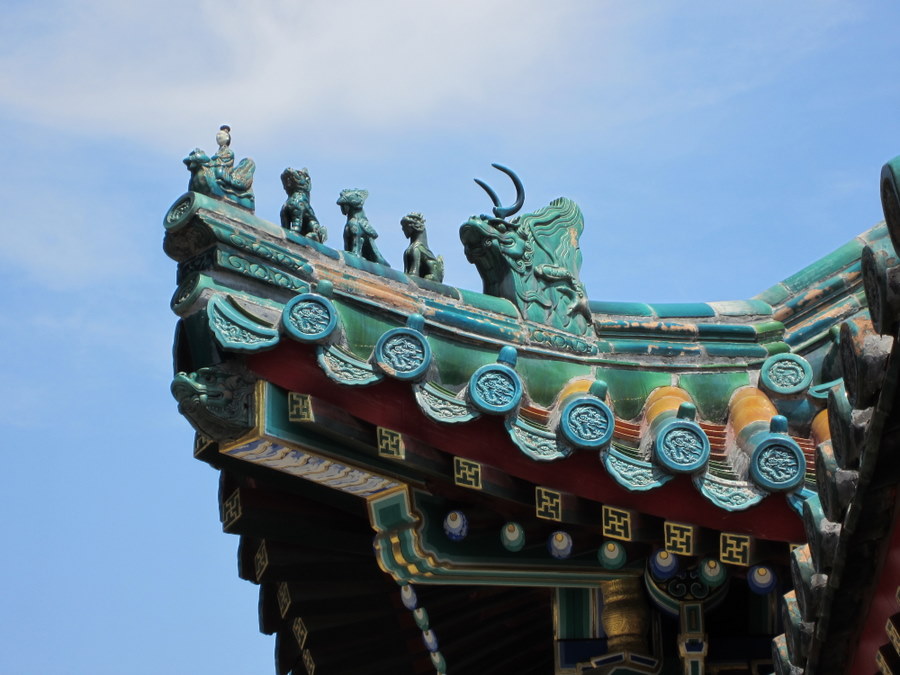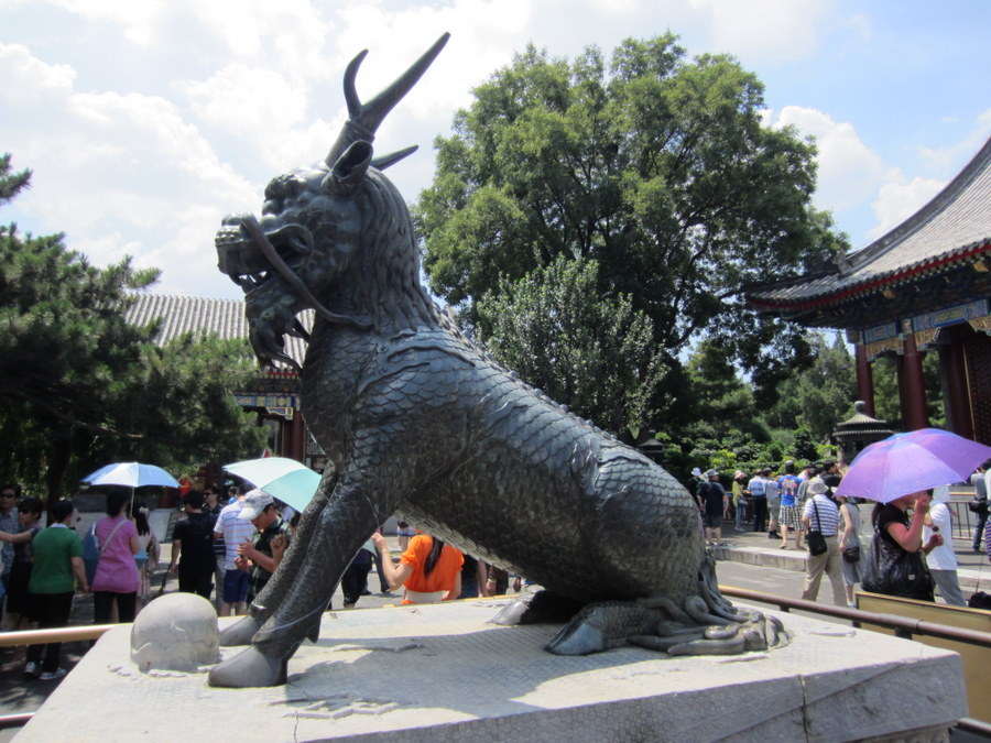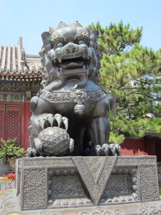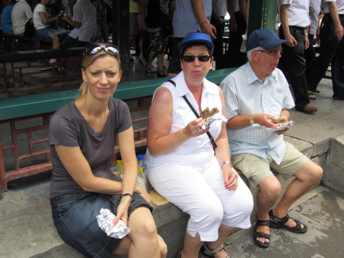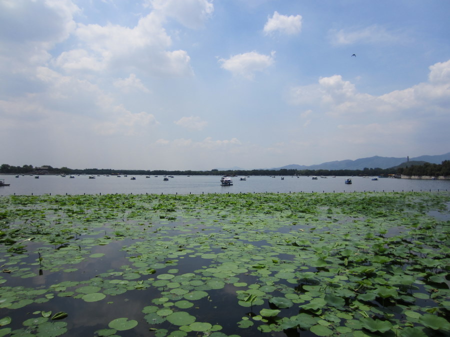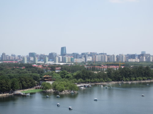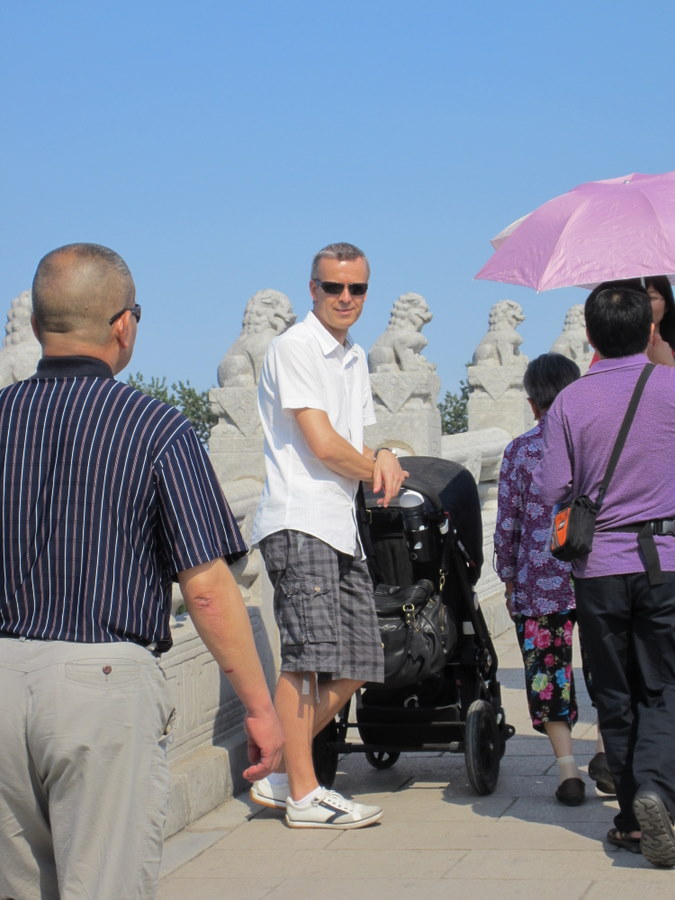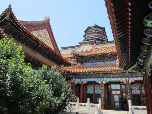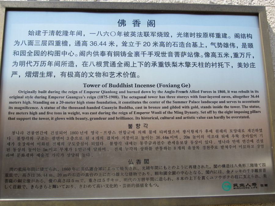 Efter vi havde nydt vores medbragte rugbrøds madpakker med spegepølse, gik Lisa, Hugo og Hans op mod Det Lange Livs Pavillon, mens Irma blev med Mads tilbage ved søbredden. Da Kunming søen blev gravet ud, blev de store mængder jord brugt til at forme højen ved søens nord side. På toppen af højen opførte kejser Qianlong en pavillon til ære for sin mors 60 års fødselsdag. Ved siden af pavillonen er der også opført et tempel med en statue af den mangearmede boddhisatva Guanyin. Her oppe fra templet er der en fantastisk udsigt ud over Sommerpaladset, Kunming søen og ind mod Beijing.