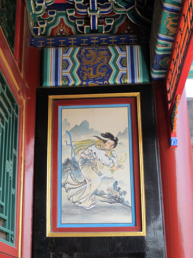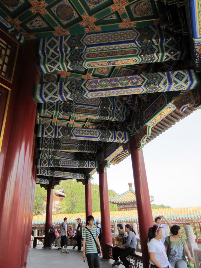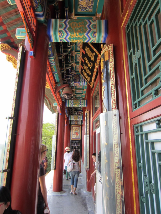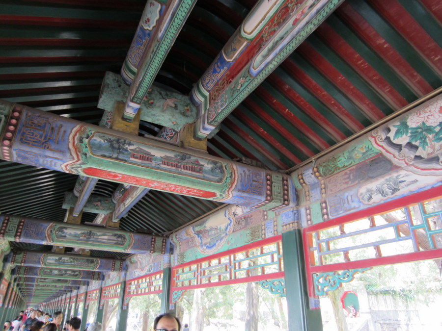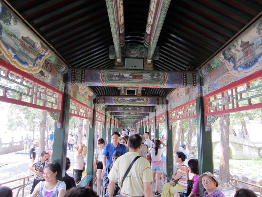Efter at have vandret noget rundt opgav vi at finde den og gik i stedet via Den Lange Gang. Langs hele nord siden af Kunming søen løber denne korridor, som er smukt bemalet med billeder fra den klassiske kinesiske historier. Gangen er bygget så de kejserlige kunne gå her uden at blive ramt af solens stråler og dermed beskytte deres lyse hud.